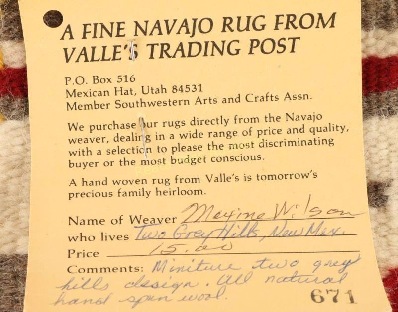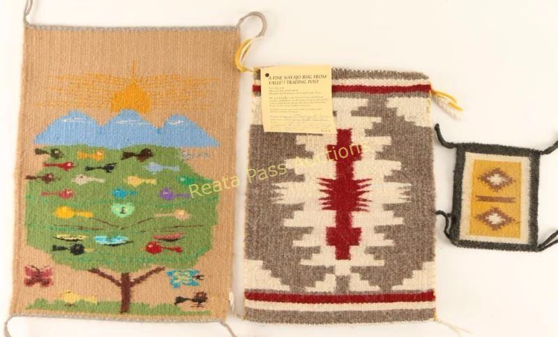 (1) Navajo Two Grey Hills design in all natural hand spun wool by Maxine Wilson measures 9 'x12 1/2", (1) Tree of Life design in multicolored wool measures 10 3/4"x14" and (1) geometric design in gold, black and cream measures 5 'x4 1/2". Nice decorative assortment.