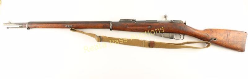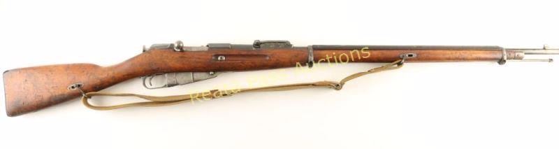 American made, Finnish military bolt action service rifle chambered in 7.62x54R, circa 1915. Features a blued finish, 31.6" barrel marked with [SA] & "stylized eagle", blade front sight, ladder rear sight, 5 round internal box magazine, hex receiver, cleaning rod, canvas sling, straight bolt handle, smooth wood handguard and full length straight grip shoulder stock with metal buttplate. Matching serial numbers on barrel, bolt & receiver. Small import marks are fount on the barrel near the muzzle, CAI St. Albans VT. Rifle retains approximately 60% of it's blued finish overall with little wear on the magazine or buttplate and moderate wear on the exposed portion of the barrel near the muzzle. Action performs well, bore is excellent and wood stock are good with cracks in the handguard & blemishes throughout. Condition is good+. ***C&R Firearm*** ***Modern Firearm***