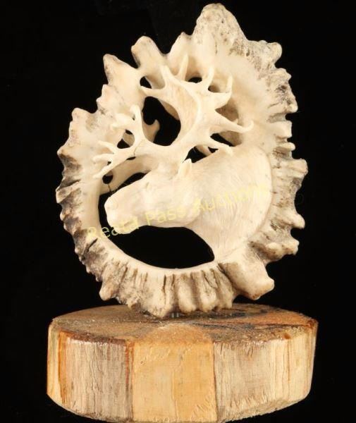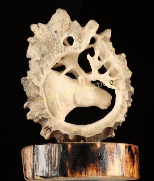 Hand crafted from the "moose button" which is the beginning of the antler by Richard Green for Alaska Creations. Openwork carving of a caribou in the center of the antler circle. Great attention to detail. Measures 5"h x 3 1/4" dia. on small log circle. A unique piece of Alaskan art.