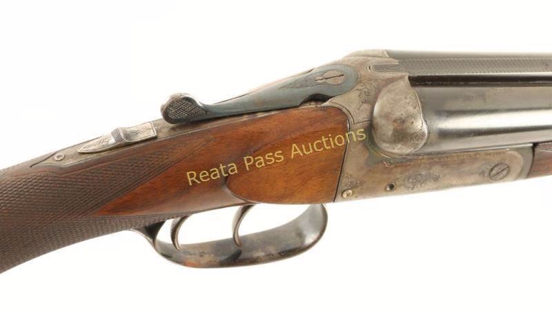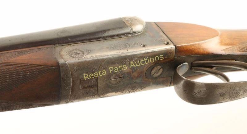 Belgium made boxlock side-by-side double barrel shotgun chambered for 28 gauge shells, circa 1880's - 1890's. Receiver & barrel are stamped "William Read & Sons Boston", a large retailer of European shotguns in the late 1800's who also had their own line of shotguns. Features blued 26.25" barrels with raised solid rib, brass bead front sight, case hardened receiver with light scroll engraving, double triggers, extractor, checkered top lever, sliding safety switch on tang, and finely hand checkered walnut forend & round knob pistol grip shoulder stock with Pachmyer recoil pad. Matching serial numbers on receiver, barrel & forend. Barrels are turning slightly plum and exhibit an area of surface rust emerging on the right barrel. Receiver shows drifting case colors with vivid colors behind recoil shields and forward of the trigger guard. Action is crisp, bores are bright with light residue, and stocks are near fine with few blemishes. Condition is very good+. ***Antique Firearm***