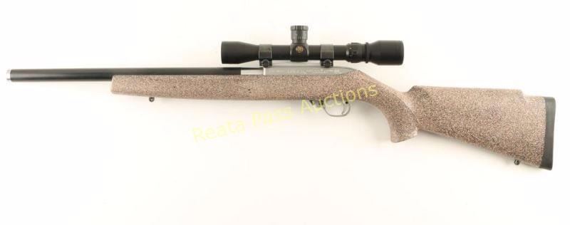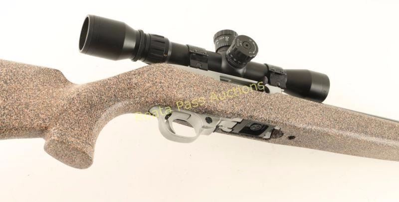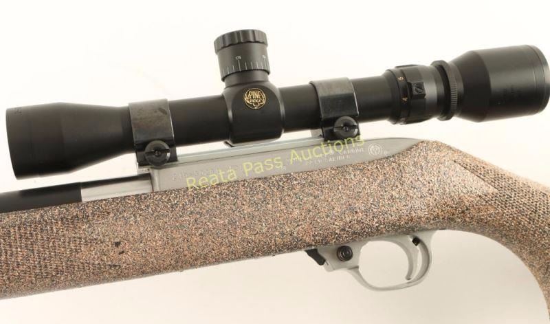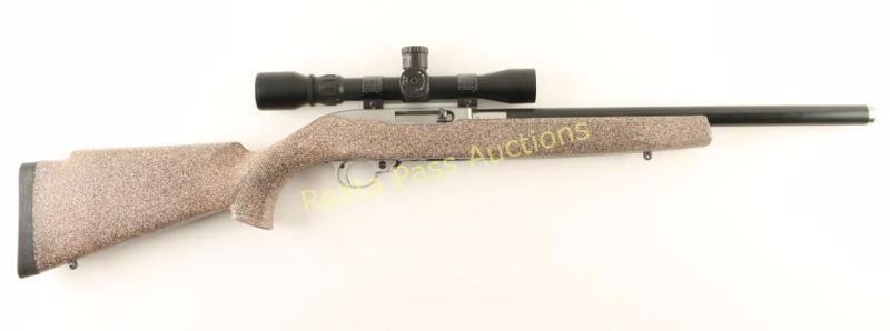 Customized semi-automatic sporting rifle chambered in .22 Long Rifle, circa 1994. Features an 18" carbon fiber sleeved bull barrel with no provisions for sights, Pine Ridge 2-7x 32mm scope, stainless steel receiver, push button safety, factory 10 round magazine, smooth trigger, swivel studs and texture-painted black synthetic Butler Creek pistol grip shoulder stock with high comb & rubber recoil pad. Rifle exhibits little to no wear on the receiver and the carbon fiber barrel sleeve shows some superficial scratches. Action is smooth, bore is pristine, optics are clear and synthetic stock has a few nicks in it's painted finish. Condition is near excellent. ***Modern Firearm***