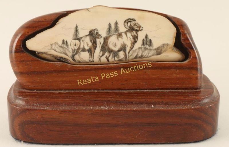 Piece of tusk with two bighorn sheep scrimshaw. Piece itself measures 3 3/4"x1 1/2". Mounted in stained wood stand-5"x2 1/2"x2". Can not be shipped, can only be sold in the state of Arizona by law and commerce.
