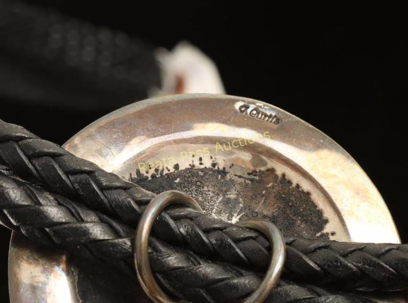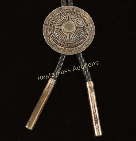 Round 2" sterling silver concho with etched scalloped edge and raised center design on thick braided leather with plain sterling ends. Maker marked and 'Sterling' on back.