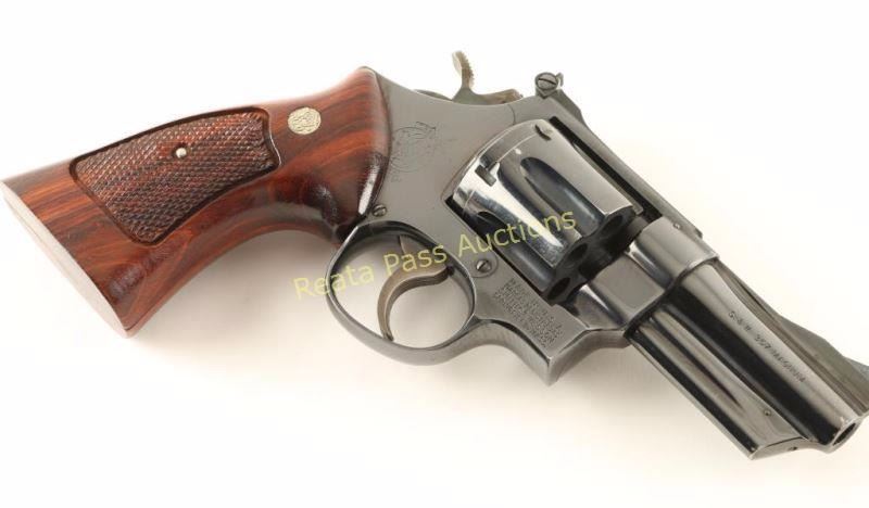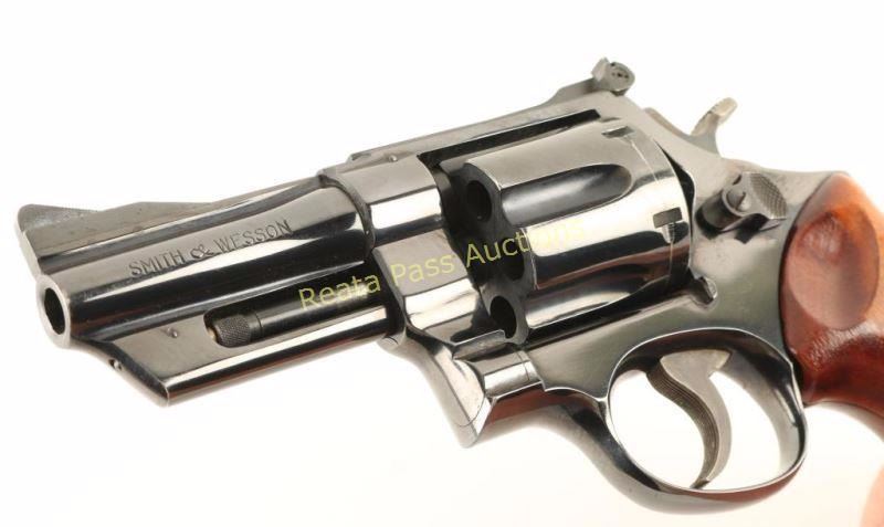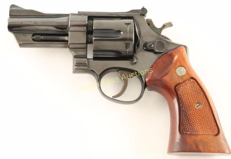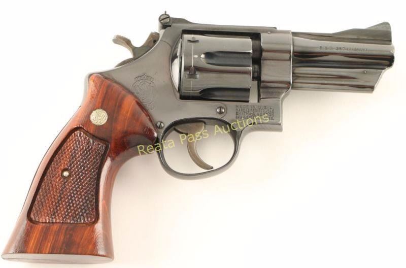 'Three Screw' Large frame double-action revolver chambered for .357 Magnum, circa 1961-1969. Features a blued finish, pinned 3.5" ribbed barrel, shrouded ejector rod, raised patridge front sight, adjustable micrometer click rear sight, fluted & counterbored six-shot cylinder, .265" grooved service trigger, .400" semi-target hammer, finely checked top strap & barrel rib, ten-groove grip straps and checkered two-piece Smith & Wesson walnut target grips. Revolver exhibits approximately 92% of it's original blued finish showing light holster wear and light handling wear. Action is smooth with very good lock-up, bore is pristine and wood grips are very good with some varnish loss on the left panel. Condition is very good+++. ***Modern Firearm***