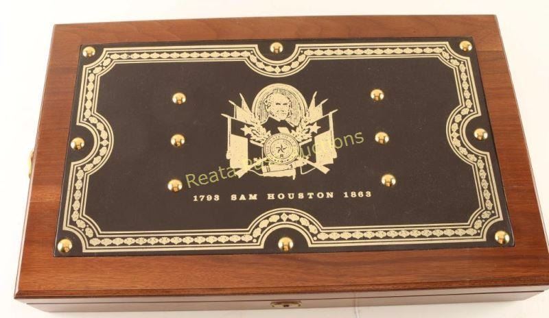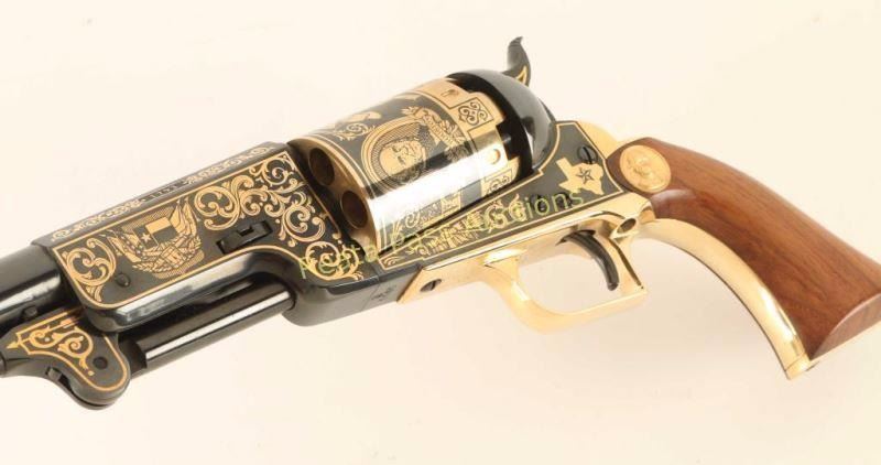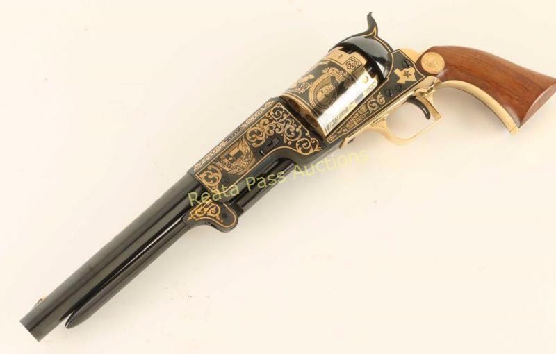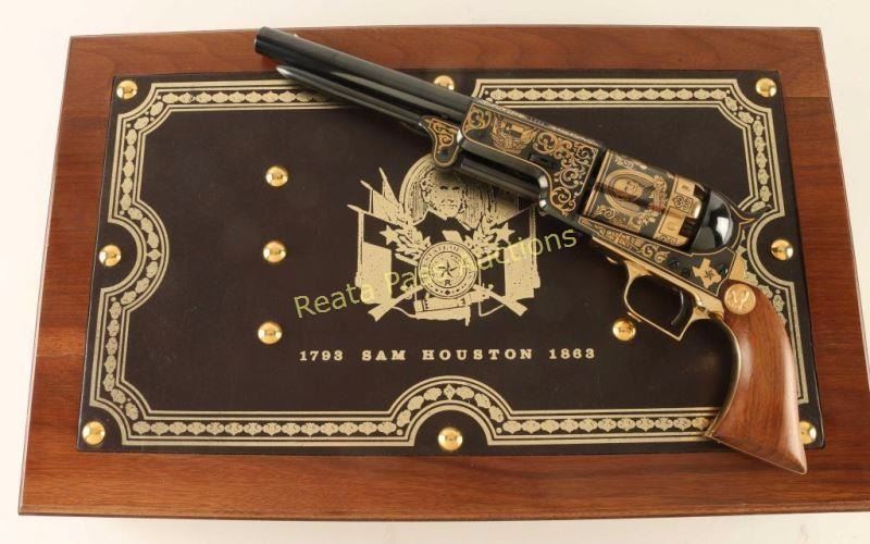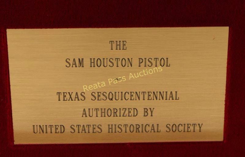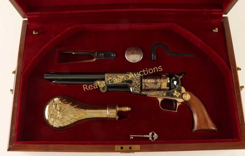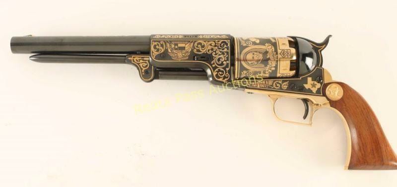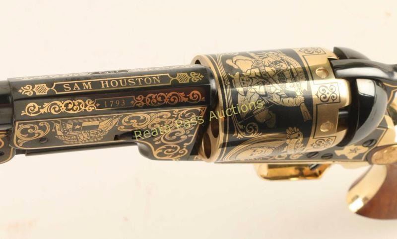 'The Sam Houston Pistol - Texas Sesquicentennial' Cased percussion commemorative revolver chambered for .44 caliber ammunition, elaborately decorated with 24kt gold accents by United States Historical Society. Features a high polish blued finish, 9" half octagonal barrel, blade front sight, loading lever, six-shot non-fluted cylinder, squared back trigger guard and one piece walnut grips. Includes a locking walnut presentation case, key, bullet mold, cap box, nipple wrench, powder flask, documents and lead balls. Revolver shows little to no visible wear. Condition is excellent. ***Antique Firearm***