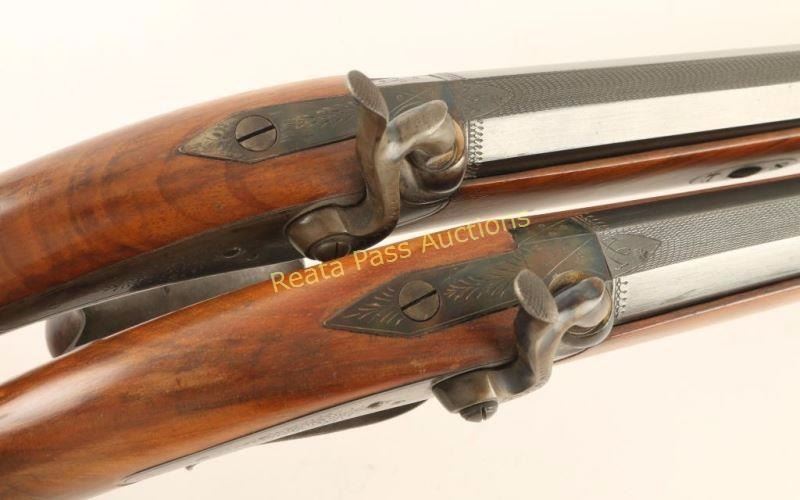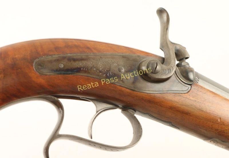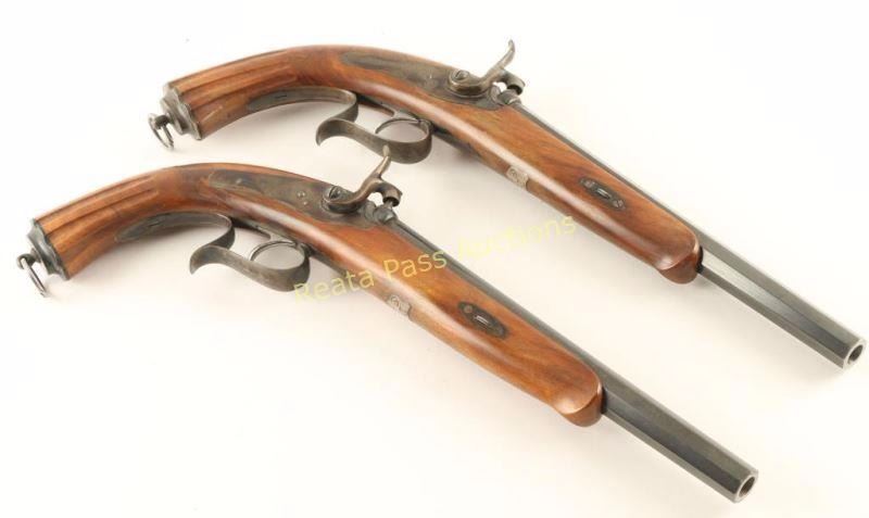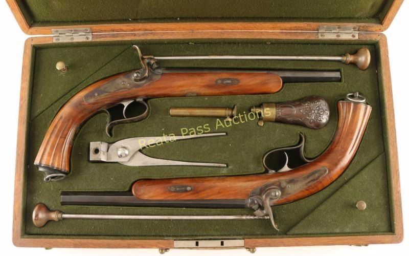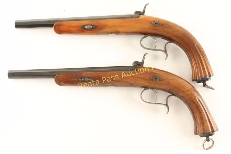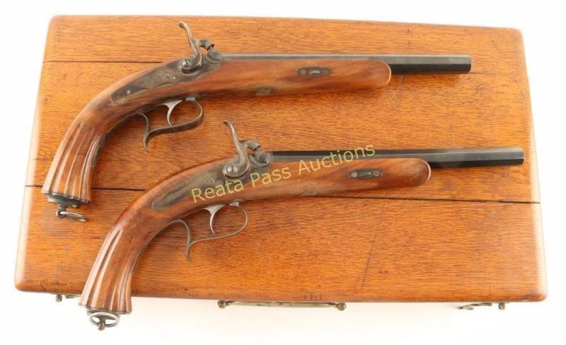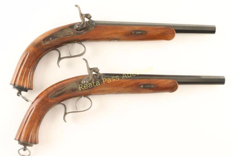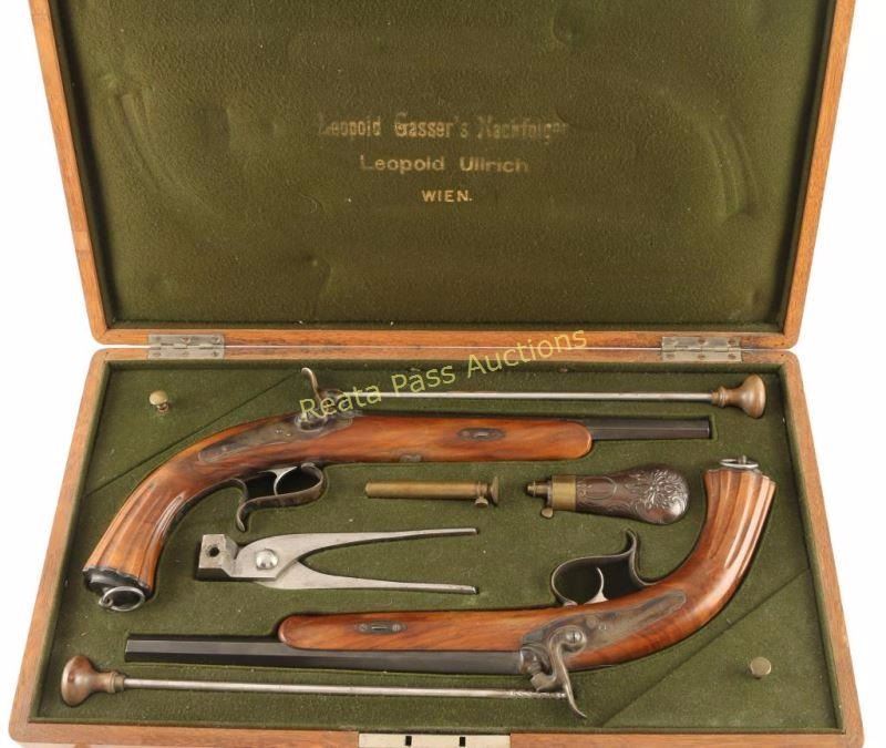 Cases & lightly engraved pair of Austrian percussion dueling pistols with approximate .43 caliber bores. Pistols bare few marking but include a small monogram on front side of wood grip that appears to be an L in front of a shield, black powder proof marks on the barrel from the Ferlach proof house and "DEP" monogrammed shied escutcheons. Pistols feature blued 9" octagonal barrels, no sights, case hardened locks with light scroll engraving, case hardened furniture, bright smooth triggers, lanyard rings and smooth one-piece wood stocks with grooved handles. Includes a fitted presentation case with green felt lining, bullet mold, powder flask, powder measurer, caps, balls and two rods. The top inside of case reads "Leopold Gasser's Nachfolger/Leopold Ullrich/Wein." which is written in gold. The barrels are marked "9806.06.10·8" and "9797.09.11·0" on their undersides. Pistols are mechanically sound and are in excellent condition showing little wear, vivid colors and fine wood stocks. ***Antique Firearms***
