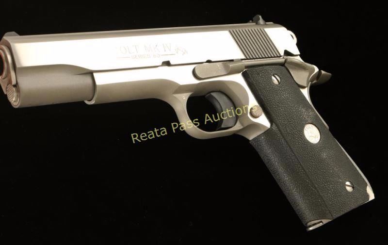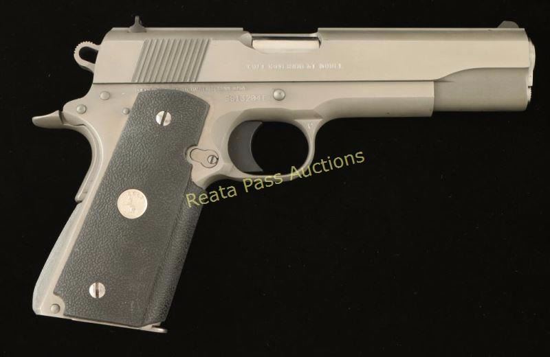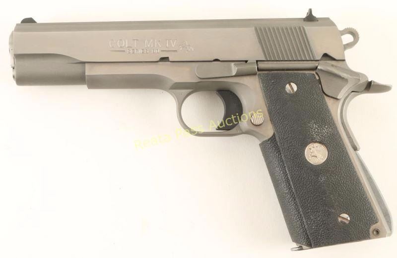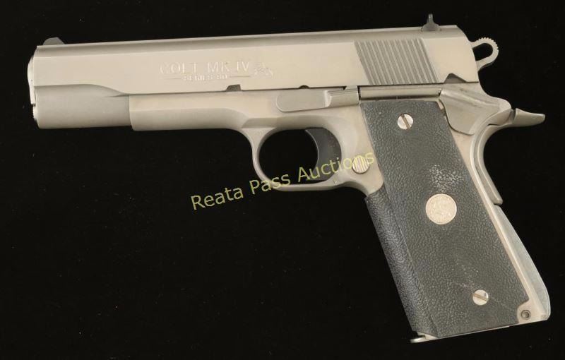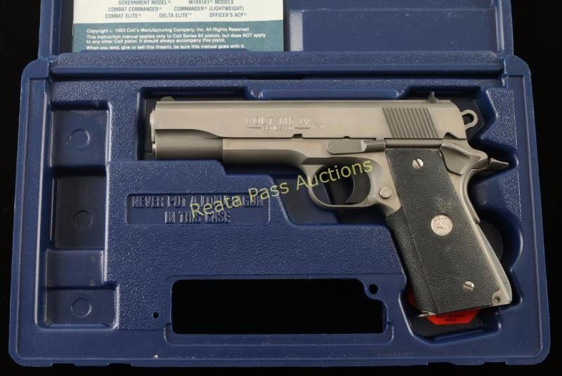 'MK IV Series 80' Stainless steel semi-automatic 1911-A1 style pistol chambered in .45 Auto. Features a brushed/satin finish, 5" barrel, three dot sights, serrated mainspring housing, smooth trigger, skeletonized hammer, thumb safety, beavertail grip safety, push button magazine release, factory magazine and textured black rubber wrap-around grips with Colt medallions. Includes the original factory hard case & sleeve with documents. Pistol exhibits little to no visible wear. Action is strong, bore is excellent and grips are fine. Condition is like new in box. ***Modern Firearm***