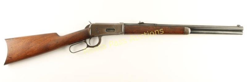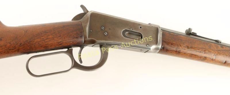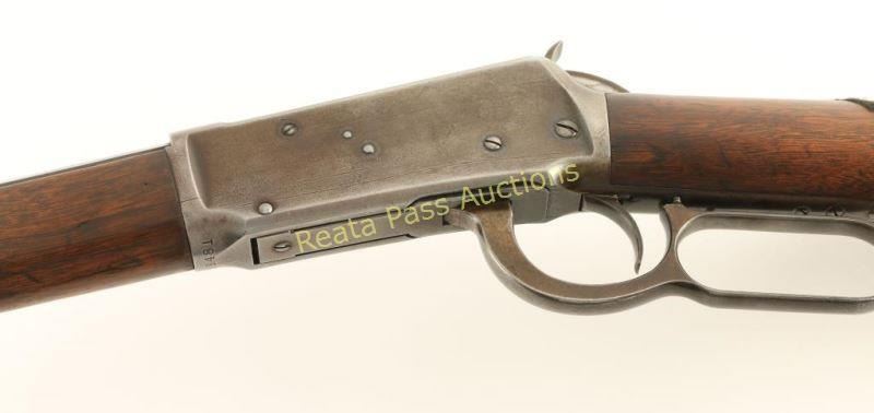 Antique lever-action repeating rifle chambered in .30 Winchester Center Fire, circa 1898. Features a blued finish, cut-down 20" octagonal barrel, full length tube magazine, Marble Sheard blade front sight, semi-buckhorn adjustable rear sight, smooth trigger, checkered hammer spur, metal forend cap, smooth walnut forearm and straight grip shoulder stock with crescent metal buttplate. The barrel and magazine appear to have been refinished and brought down to approximately 35% thin finish and the receiver has primarily turned to a brown patina. Marking are all visible with dark bluing within the lettering. Action is smooth, bore has a semi-dull appearance with good rifling and wood stocks are very good with the shoulder stock slightly shrunken at the toe & the forend baring several small dings. Condition is good++. ***Antique Firearm***