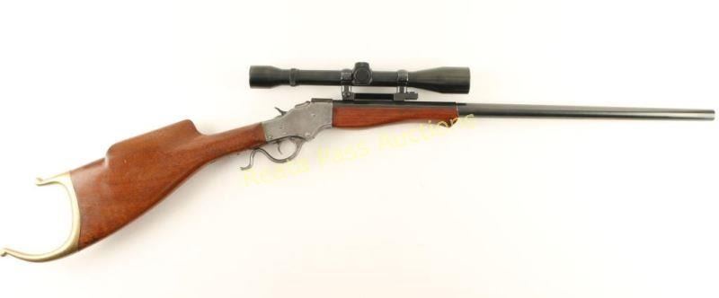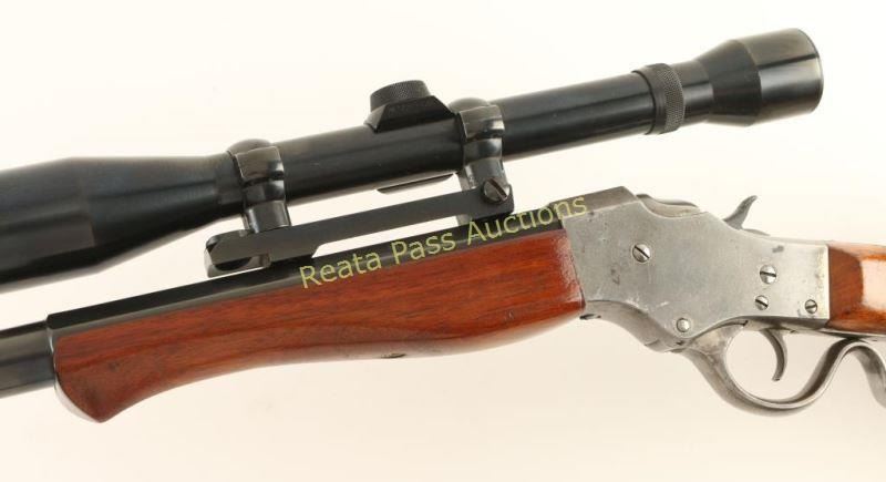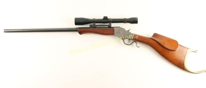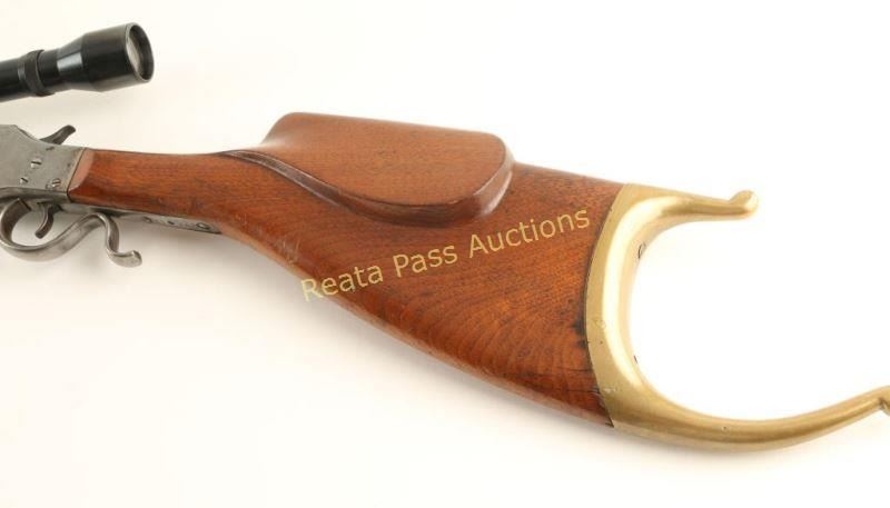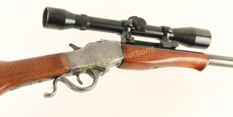 American single shot falling block rifle chambered in .225 Winchester, circa 1903-1916. Features a blued factory style 25 5/8" half octagonal barrel with no marker mark, no provisions for sights, Weaver K61 scope, smooth trigger, 's' shaped lever, checkered hammer spur, smooth contoured walnut forend and Schutzen style shoulder stock with fancy brass buttplate. Barrel retains approximately 99% of it's blued finish while the receiver is in the white showing some remnants of a case hardened finish in protected areas. Action is crisp, bore is excellent and wood stocks are fine. Condition is very good+. ***C&R Firearm*** ***Modern Firearm***