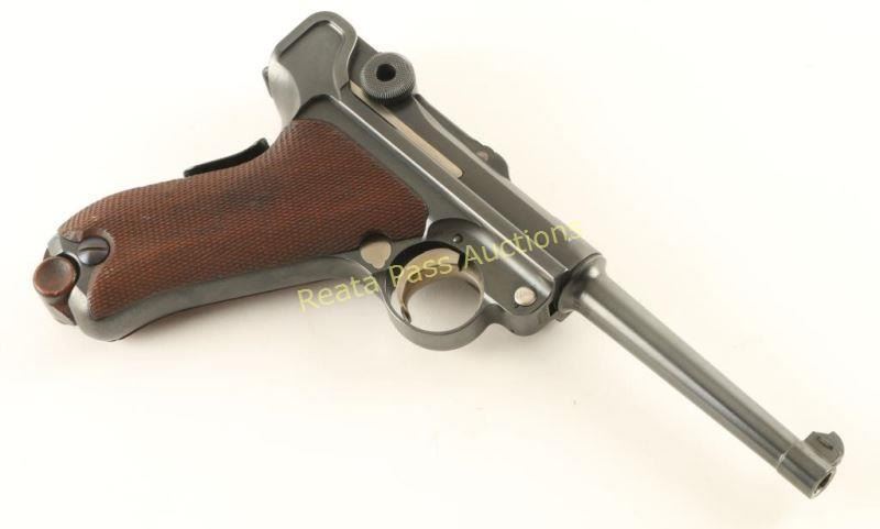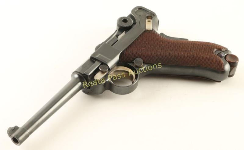 Expertly restored, German made semi-automatic commercial pistol chambered in 7.65x21mm Parabellum. Features a fine blued & straw colored refinish, 4 3/4" barrel, dovetailed inverted "v" front sight, extractor marked Loaded, notched rear sight, all-matching numbers, thumb safety lever, grip safety, 'GERMANY' import mark on frame below the serial number, correct nickel-plated wraparound body magazine with unmarked wood base, and two-piece factory checkered walnut grips. Pistol exhibits approximately 97% of it's blued refinish showing some light pin-prick pitting around the front sight ring, slight discoloration on the grip safety and a couple light pits observed on the left edge of the toggle. Straw colors are well accomplished and vivid and markings are crisp. Action is sound, bore is frosty with good rifling and grips are very good with semi-worn checkering. Condition is near excellent as refinished. ***C&R Firearm*** ***Modern Firearm***
