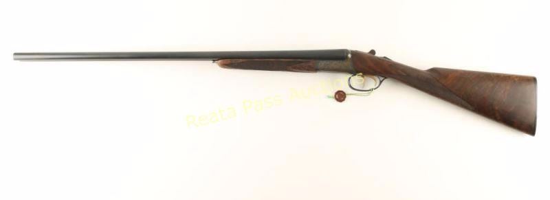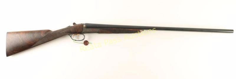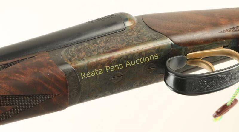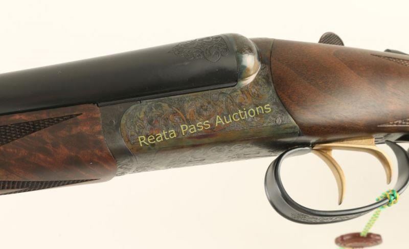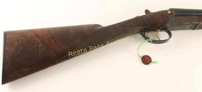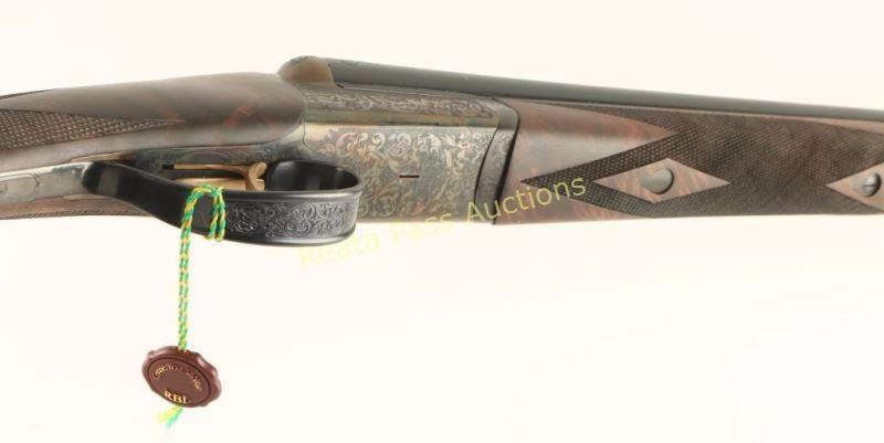 SN: RBL001514 'Launch Edition' Fine American made round-action side-by-side shotgun chambered for 2 3/4" 20 gauge shells. Features 28" blued barrels with removable imp. cyl. & skeet chokes, automatic ejectors, concave rib, brass bead front sight, scroll engraving, case hardened receiver, double triggers, auto tang safety, checkered top-lever, 14 1/4" length of pull, fancy checkered 3x walnut forend and straight grip shoulder stock with serrated hard rubber buttplate. Includes a Galazan tradition English style trunk case wrapped in canvas with felt lined interior which includes a cleaning set, accruements and leather choke pouch with full, modified, improved modified & tool. Shotgun exhibits approximately 99% of it's original finish with only minor wear on the forend iron observed. Action is smooth, bores are impeccable and wood stocks are extra fine showing only a very small loss on left side of the forend in the top right corner. Condition is like new in case. ***Modern Firearm***