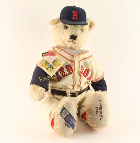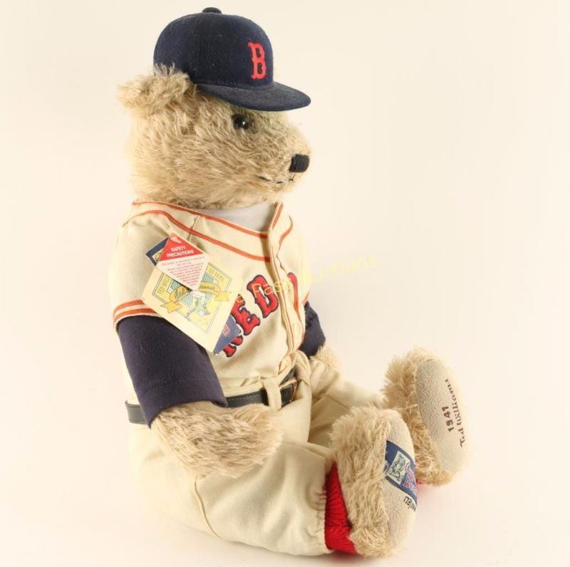 limited Edition teddy bear in Boston Red Sox cap and uniform. He is made of light brown mohair fur with glass eyes, and a hand stitched nose and mouth. At 21 inches tall, this bear is a Limited Edition of 1006 pieces worldwide. '1941 Ted Williams' on left foot, 'Cooperstown Bears' with logo and 173/1006 on the right foot. Measures 12"x17"x10" seated. Original tags still attached. overall good condition. Great collector's item for the baseball fan.