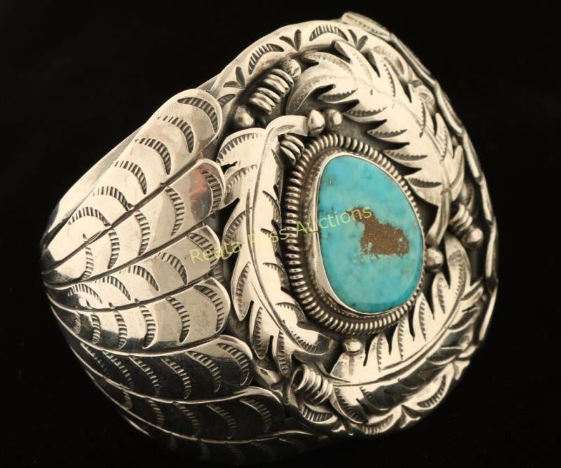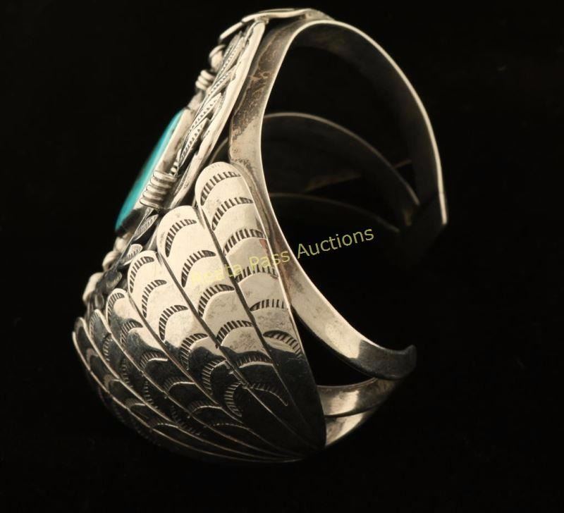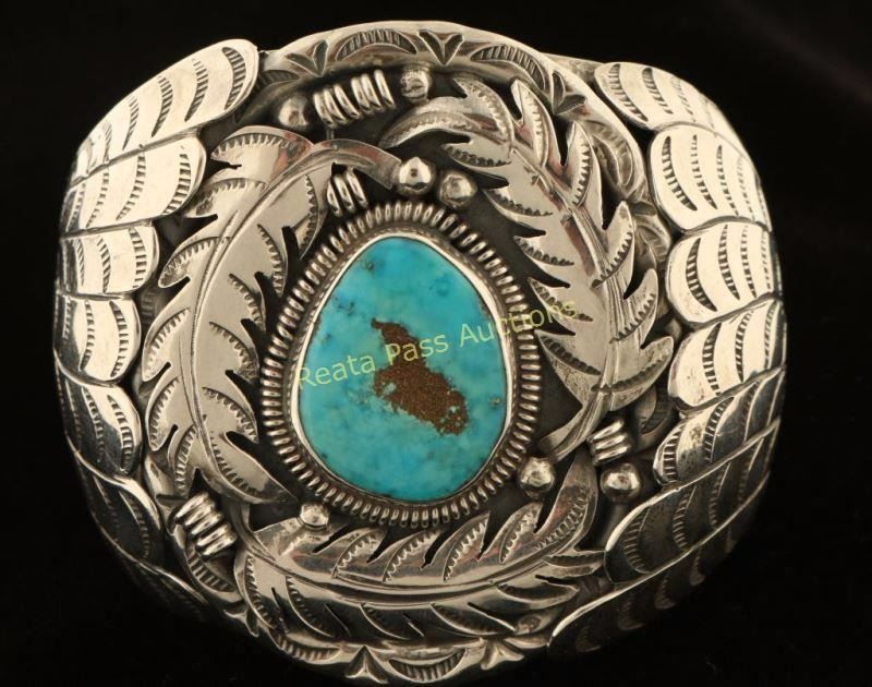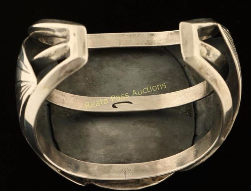 Beautiful center stone with yellow gold matrix, surrounded by some of the best sterling work we have ever seen with leaf, scrolled, and molded design, maker marked with a fishing hook, very heavy and high quality.