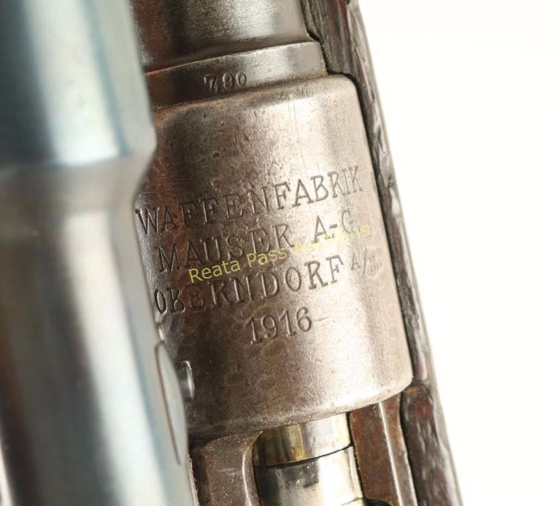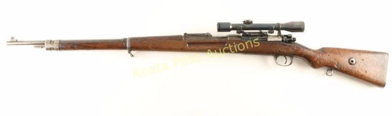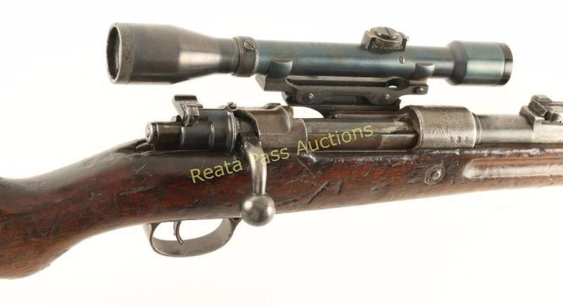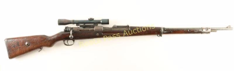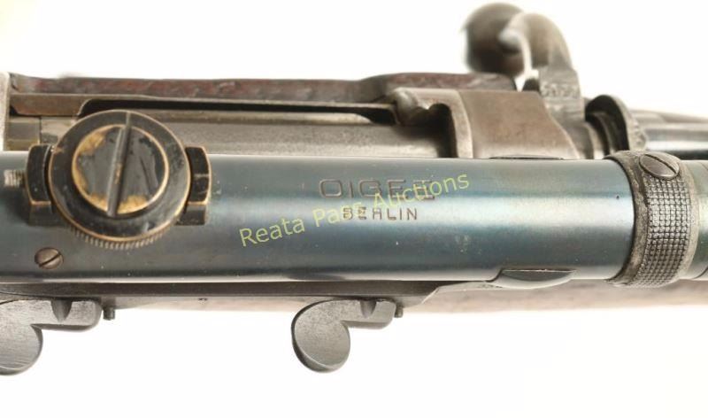 Rebuilt WWI era German military bolt action service rifle chambered in 8mm Mauser. Manufactured by Mauser, Oberndorf circa 1916 and imported by CAI, St. Albans, Vermont. Features a 29" barrel, ramped front sight, 2,000 meter graduated rear sight, side mounted scope base #334, Oigee 4x 26mm scope #305004, Imperial proofed receiver, two barrel bands, bayonet lug, sling swivels, safety switch on bolt, and wood handguard & semi-pistol grip shoulder stock with smooth metal buttplate. Serial numbers match on barrel & receiver. Wood stocks bare many markings and are in near good condition with above average blemishes. Rifle's finish has drifted to a dark grey on the barrel and to a light brown patina on most other metal surfaces with pitting on bolt release lever. Action is smooth, bore is very good, and optics are clear with little wear on scope tube. Condition is good++. ***C&R Firearm*** ***Modern Firearm***