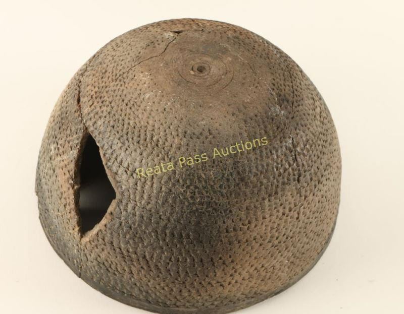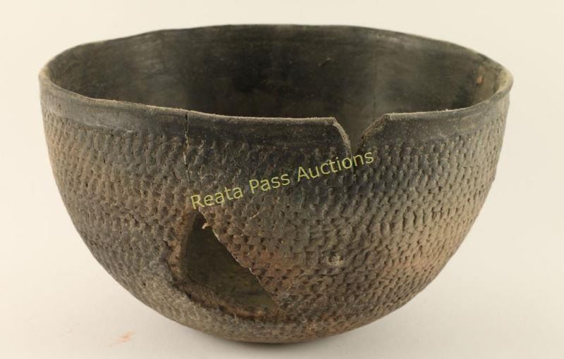 Hohokam basketweave texture bowl that has been broken and repaired. Hole and triangular chip on one side of bowl. Measures 5"h x 9"dia.
