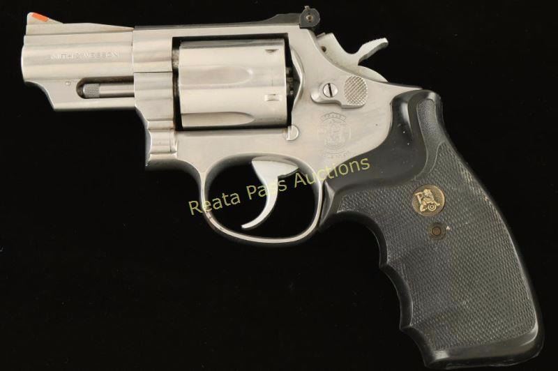 'Combat Magnum' Stainless steel double action revolver chambered in .357 Magnum, circa 1986-1994. Features a brushed finish, 2.5" barrel with solid top rib, shrouded ejector rod, ramped blade front sight with orange insert, micrometer click rear sight, fluted six shot cylinder, .312" smooth combat trigger, .375" semi target hammer, and two-piece Pachmayr checkered black rubber grips. Revolver exhibits moderate to heavy handing wear, is very dirty and shows rust on the triggerguard & on the frame under the cylinder. The revolver appears to have been dropped as there is damage on the left side of the rear sight. Action is smooth with good luck-up, bore is good, and rubber grips are very good. Condition is good. ***Modern Firearm***