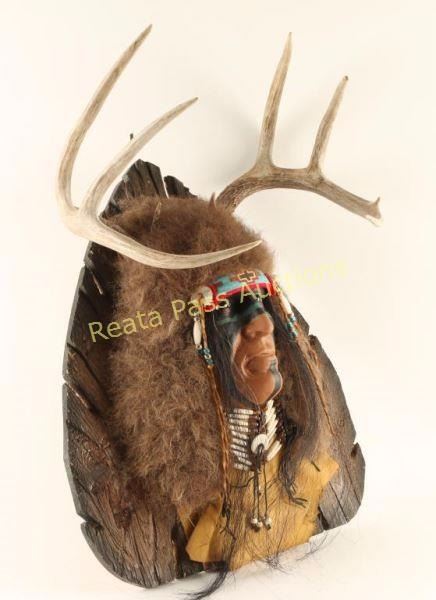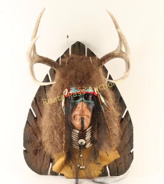 Compelling depiction of a ceremonial spirit who dances to insure plentiful game during hunting season. Symbolizing victory, his face is painted in black and is accented with a generous use of authentic trims. These include horse scalp locks, buffalo fur, crow beads, a long bone choker, a headband with a red trade cloth and a wonderful set of antlers. From the tips to the bottom of the buckskin it is 25" long and 16" wide. Includes wood plank. By Dennis Black Wolf for Super Moon, it is hallmarked and numbered 38/400 circa 2000.