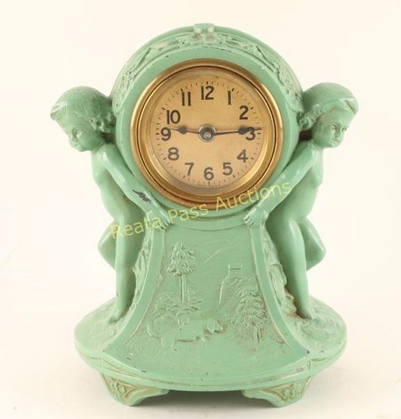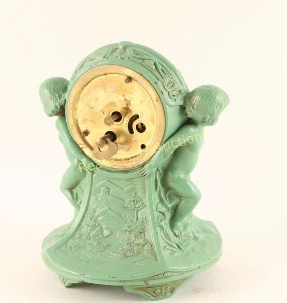 Two cherubs on either side of brass faced clock. Interior stamped design is a hunting scene. Metal is painted a matte mint green. Measures 6"x5" approx.