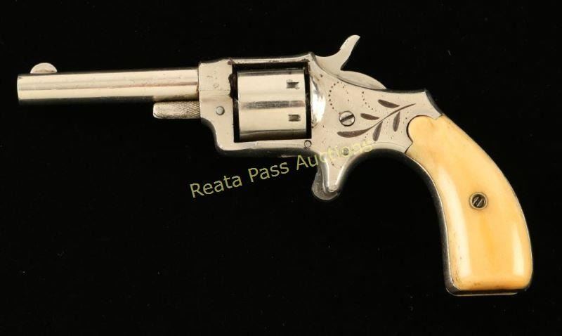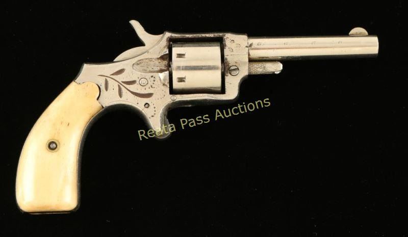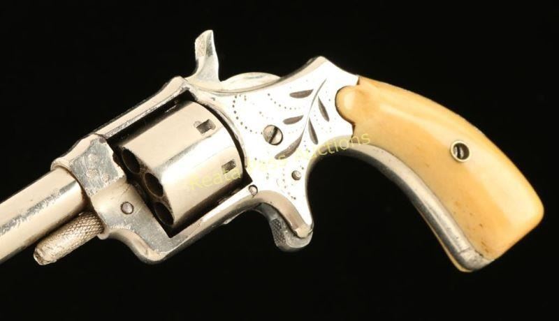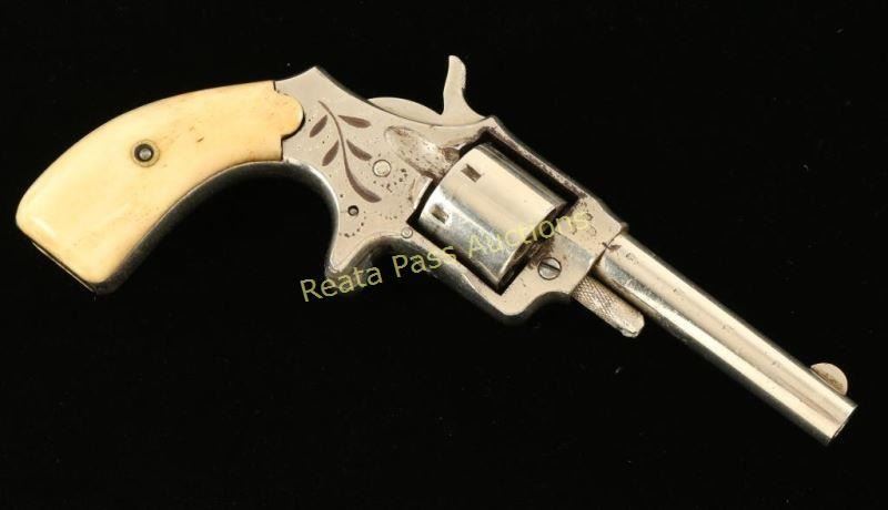 Engraved single-action spur trigger revolver chambered in .22 rimfire, manufactured by Hopkins and Allen circa 1879-1889. Features a nickel plated finish, 2 3/4" barrel, blade front sight, notched rear sight, non-fluted seven shot cylinder, light floral engraved frame, checkered spur trigger & hammer spur, and smooth two-piece bone grips. Revolver exhibits approximately 87% of it's nickel plated finish showing small losses on the frame around the cylinder and a few other small scattered losses. Action is good with fair lock-up, bore is fair with light scattered pitting and grips are fine. Condition is good to very good. ***Antique Firearm***