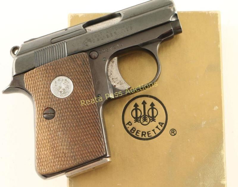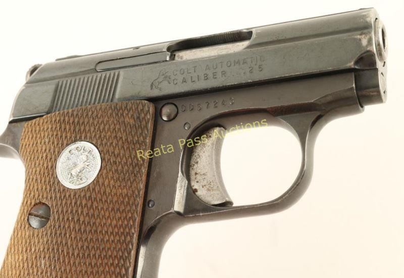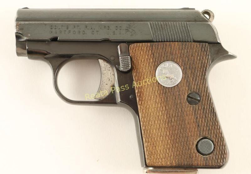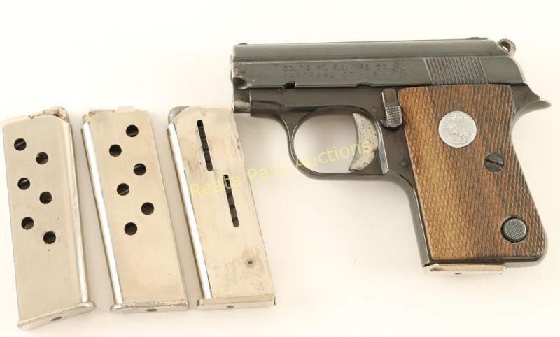 U.S. production pocket size semi automatic pistol chambered in .25 Auto. Features a blue finish, 2.25" barrel, fixed sights, smooth trigger, serrated round hammer spur, push button magazine release, factory 6 round magazine, manual safety/slide catch and Colt medallion checkered wood grips. Includes an extra factory magazine and two aftermarket magazines. Pistol retains approximately 80% of it's original blued finish showing high point edge wear, the frame turning plum and some scattered light surface rust observed around the front strap, in the slide serrations & near the muzzle. Action is smooth, bore is excellent and wood grips are very good. Condition is good+. ***Modern Firearm***