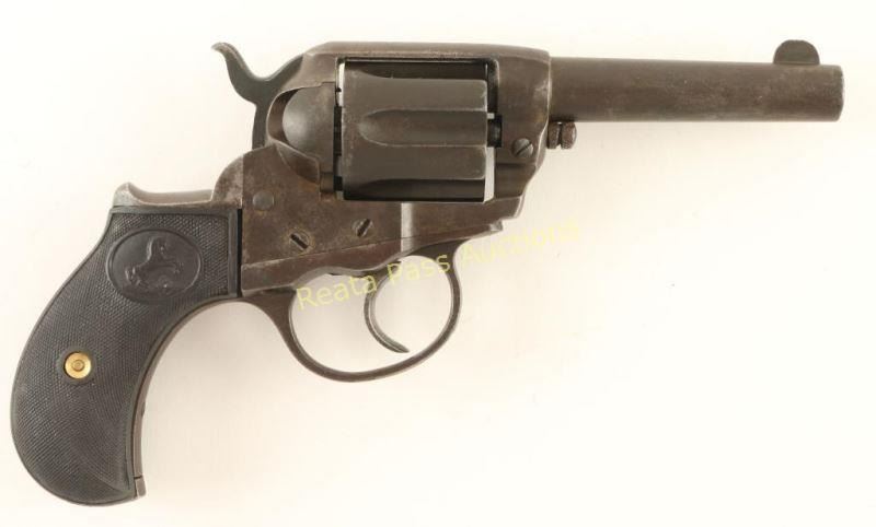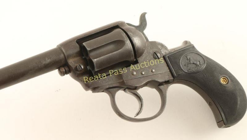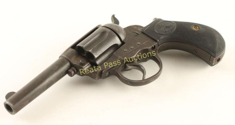 'Sheriff's Model' Vintage double-action revolver chambered in .38 Colt, circa 1904. Featured a 3.5" barrel with two line address, no ejector rod, blade front sight, 'v' notched rear sight, long fluted six-shot cylinder, small checkered cylinder pin head, smooth trigger, checkered hammer spur and two-piece checkered black plastic grips with Rampant Colt motif. Revolver exhibits an even dark aged patina throughout. The only legible serial number is on the backstrap with the other two set of numbers removed, the revolver otherwise has good visible markings. The hammer appears to have been modified slightly. Action is in working order with five clicks & solid lock-up, bore is good with some pitting and grips are very good but are likely replacements. Condition is good. ***C&R Firearm*** ***Modern Firearm***