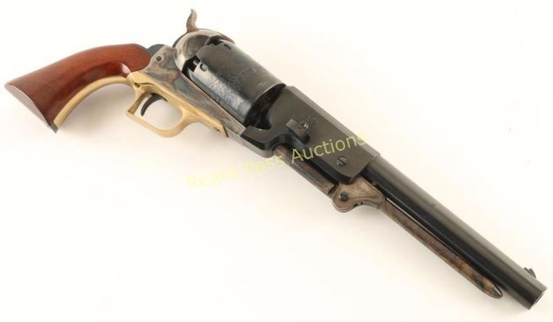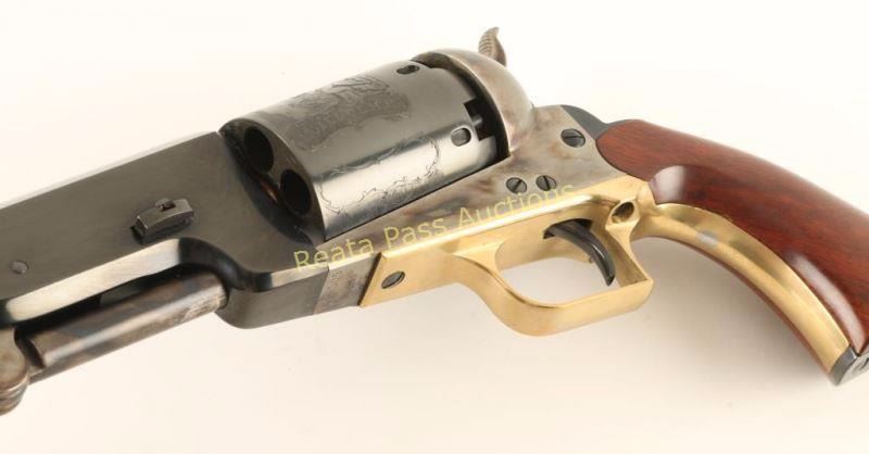 Italian made replica percussion revolver chambered for .44 caliber ammunition, circa 2005. Features a blued & case hardened finish, 9" half octagonal barrel, notched blade front sight, loading lever, six-shot roll stamped cylinder with Indian battle scene, brass square back trigger guard, checkered hammer spur, and one piece varnished walnut grip. Includes a factory cardboard box with instruction manual. Revolver exhibits approximately 99% of it's original finish showing little to no visible wear. Action is smooth, bore is pristine and wood grip is near fine with a small loss on the left side along the front strap. Condition is near excellent. ***Antique Firearm***