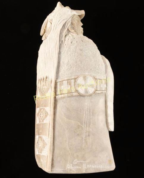 Gray alabaster depicting Navajo warrior with wolf headdress and shield. Signed 'Alvin K Marshall' on back. Measures 14 3/4"x7"x5 1/4". Alvin Marshall is one of the most accomplished sculptors working today and he is gaining increasing attention on the Native American art scene. Over the last two decades, Alvin has received much acclaim in the art world, including the Rising Stars 2001 exhibit at the Desert Caballeros Museum in Wickenburg, AZ. In the early 80"s, he was named Sculptor of the Year at the Native American Art Show sponsored by the famous Heard Museum in Phoenix. Marshall's images that emerge from alabaster stone tell stories of his Navajo culture. Marshall believes there is a need for spiritual connection among different peoples. His special gift is the ability to produce art that embodies an authentic spirituality that can unite. He worries that "we've lost the togetherness as a people" and hopes that through his art he can share the closeness and harmony that was at the heart of Navajo life.