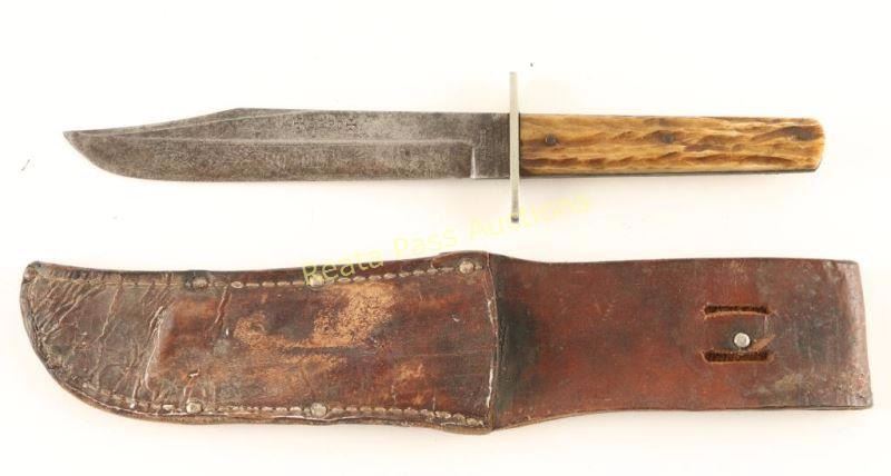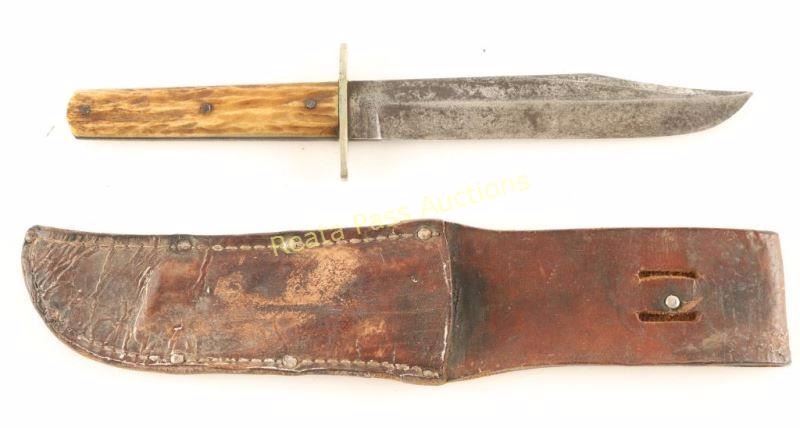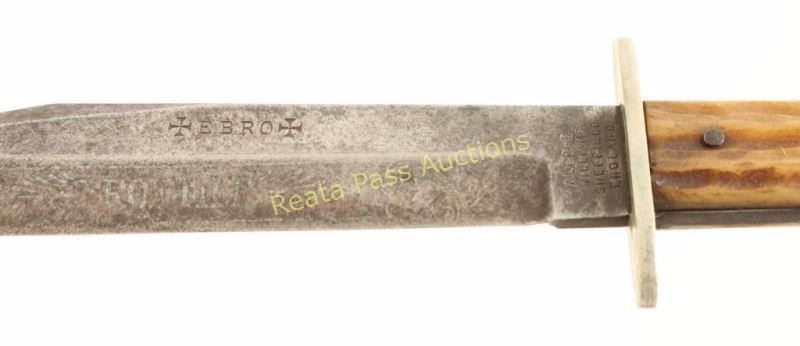 Sheffield England, 'EBRO' imported by Kestor Knife Co. 1890-1980. Etched "Frontier" blade, measures 10" overall with a 6"blade. JIggered bone handle with three iron pins and a silver guard. Comes in leather sheath that shows age and use.