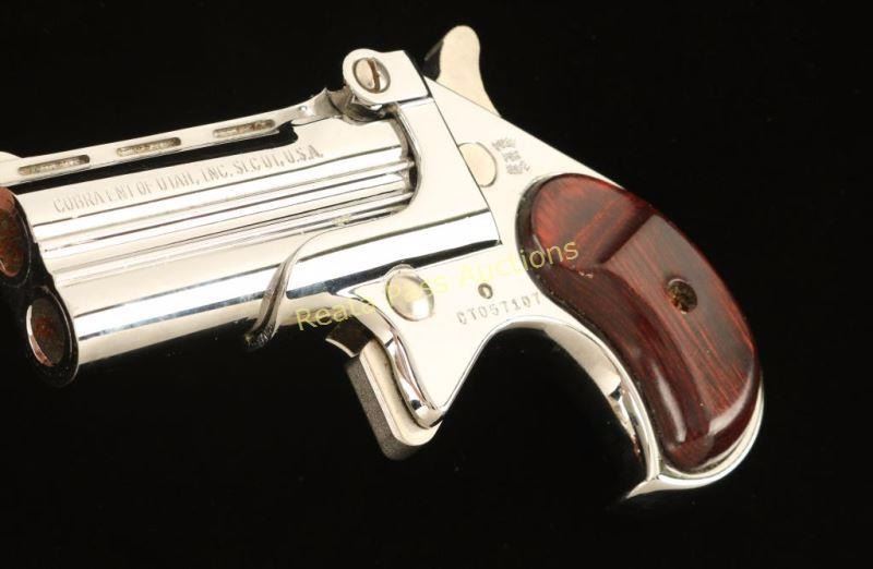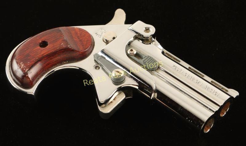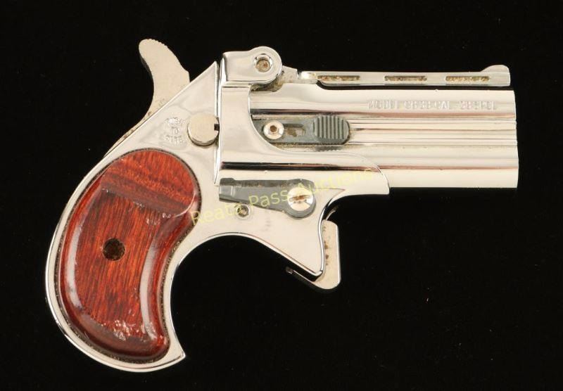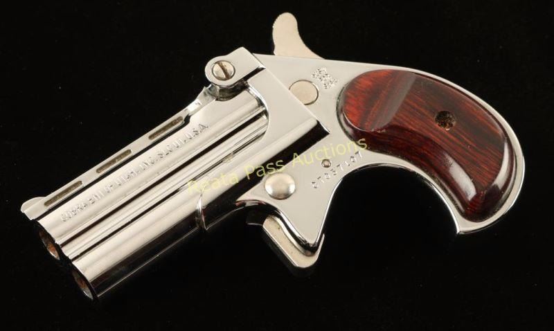 Over & under double barrel spur trigger derringer chambered in .38 Special. Features a bright nickel plated finish, 2 3/4" barrels with ventilation top rib, fixed sights, spur trigger, push button safety, auto-rotation barrel selector, manual ejector, and two-piece rosewood grips. Derringer shows light handing wear and a few small losses on the left side of the barrel. Action is sound, bores show rust, and grips are fine. Condition is good. ***Modern Firearm***