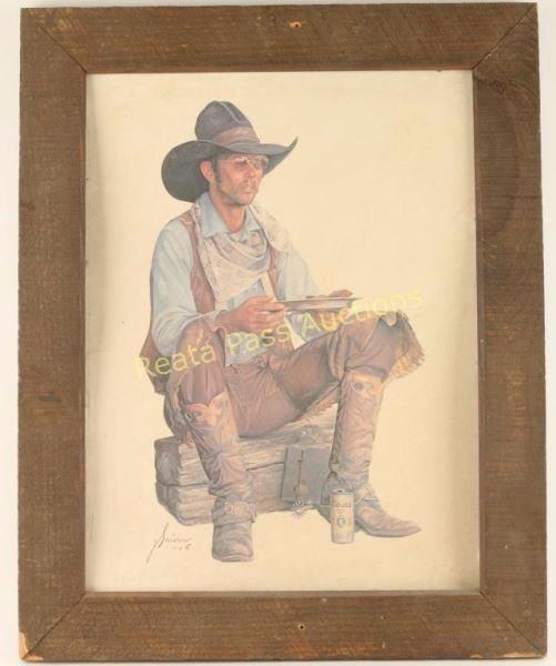"Baked Beans and Beer" 19 1/2"x14 1/2" in rustic barnwood frame, some small losses to print.