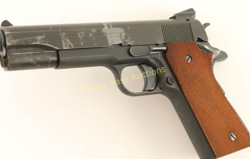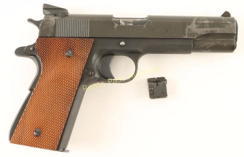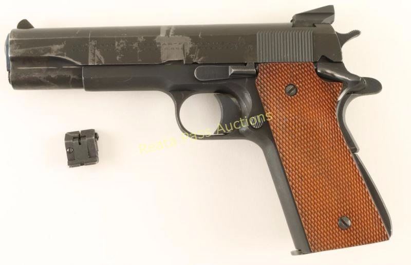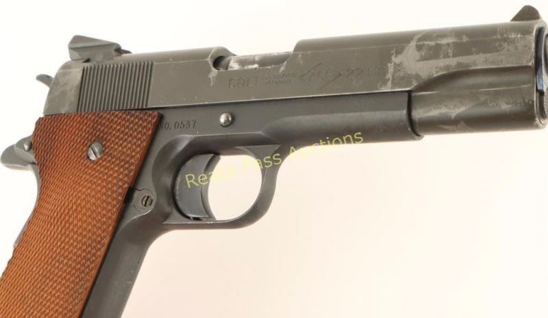 SN: 0537 Put-together 'Colt Service Model Ace' semi-automatic pistol utilizing an A. R. Sales Co. frame. Features a Colt Service Model Ace slide, 5" Colt barrel, patridge front sight, Hexsite rear site, A.R. Sales Co. alloy frame, 10 round Colt Service Model Ace magazine, serrated main spring housing, grip safety, thumb safety, smooth trigger, serrated hammer spur, and custom two-piece checkered wood target grips. Includes another rear sight which is quite possibly the original sight for the slide. The slide is marked "COLT'S PT.FA.MFG.CO.HARTFORD,CT.U.S.A./PATENT NUMBERS ? 2.090.656 ? 2,090,657" [Rampant Colt] and the right side is marked "COLT SERVICE MODEL ACE .22 LONG RIFLE." The barrel bushing is marked O.I. Dwyer. The slide retains approximately 70% of it's black finish with moderate spots of wear down to the metal. Action is smooth bore is pristine and wood grips are fine. Condition is very good. ***Modern Firearm***
