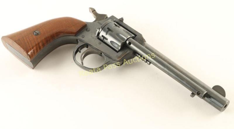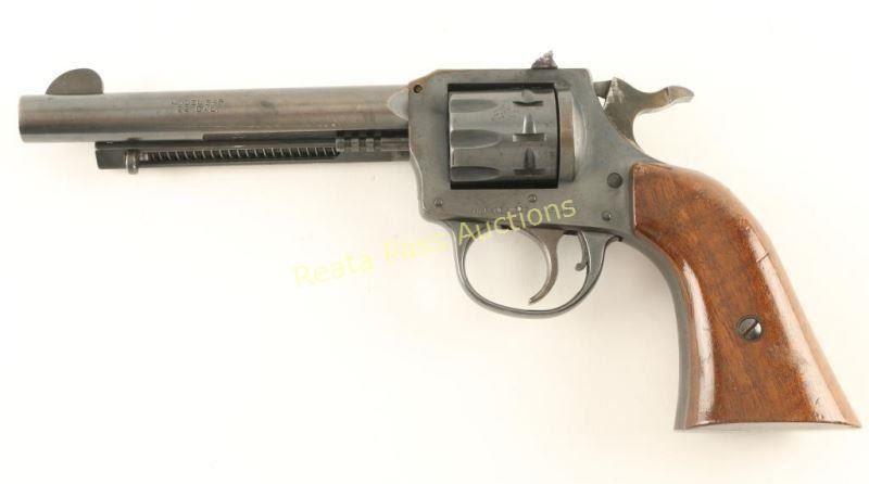 SN: AL28344 Double action nine-shot revolver chambered in .22 Short, Long or Long Rifle, circa 1961-1972. Features a blued finish, 5.5" barrel, ejector rod, blade front sight, dovetailed rear window sight, fluted cylinder, beveled trigger, serrated hammer spur, and smooth one piece wrap-around wood grips. Revolver exhibits approximately 75% of it's original finish showing thinning on the barrel, some light tooling marks on the frame and a few small areas of light surface rust scattered on the revolver. Action is smooth with good lock-up, bore is excellent and wood grips are very good with some small blemishes. Condition is good+. ***Modern Firearm***