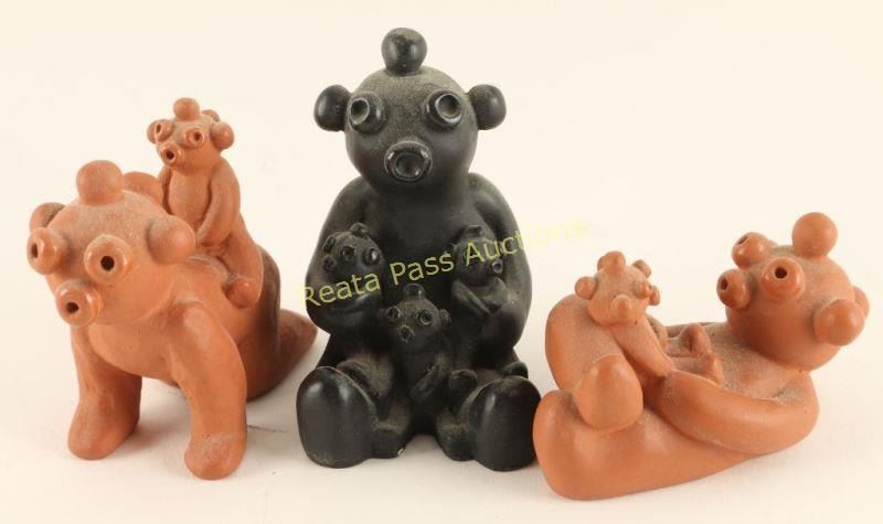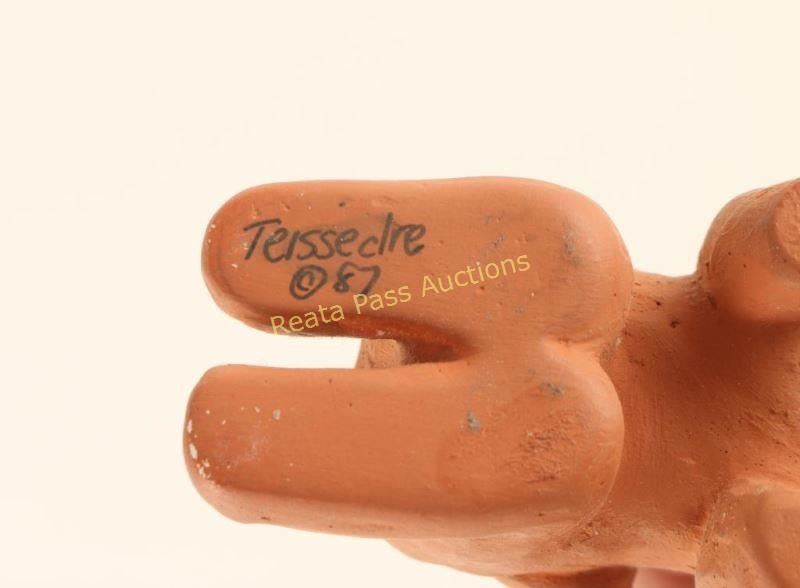 Storyteller kachinas in terra cotta pottery, one in black. Two are signed 'Teissedre'. Measuring 1 3/4' to 3" high. Small whimsical figures.
