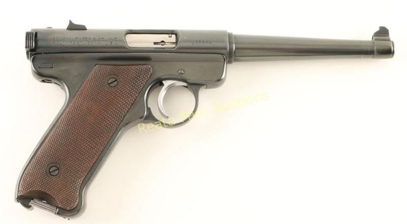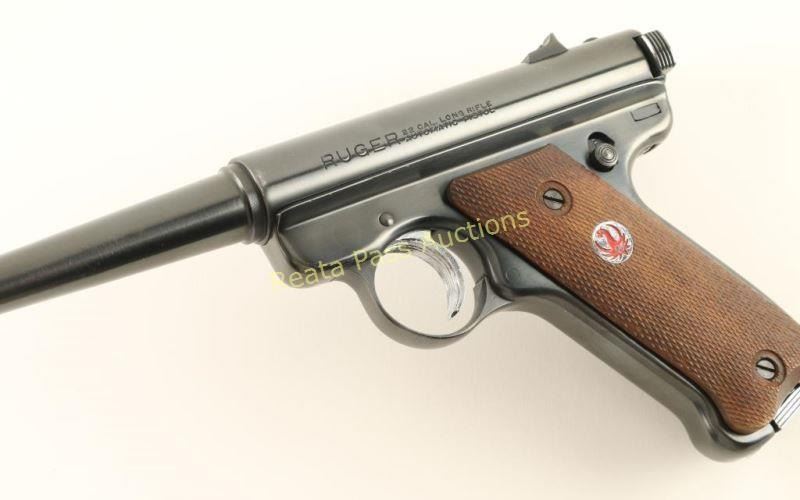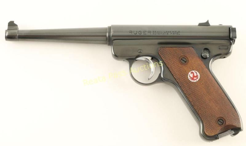 Single action semi-automatic target pistol chambered in .22 Long Rifle, circa 1966. Features a blued finish, 6" tapered barrel, patridge front sight, dovetailed rear window sight, serrated chrome trigger, hold open lever/thumb safety, 9 round magazine with chrome floorplate and two-piece checkered wood grips with red filled Ruger medallion on the left panel. Pistol exhibits approximately 94% of what appears to be a high quality refinish showing some high point edge wear and light handling marks. Action is smooth, bore is excellent and grips are very good with semi-worn checkering. Condition is very good+. ***C&R Firearm*** ***Modern Firearm***