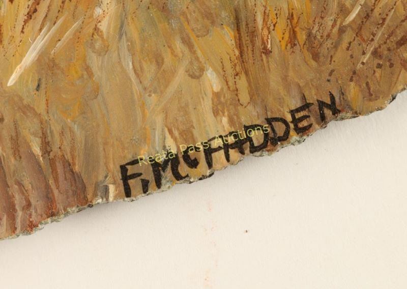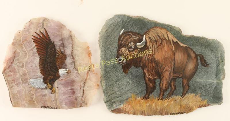 One depicting a flying eagle on marble with variations of purple, gray and gold. Measures 7"x7". Other stone is a greenish gray with a buffalo on it. Both are signed F. McFadden on lower edge.
