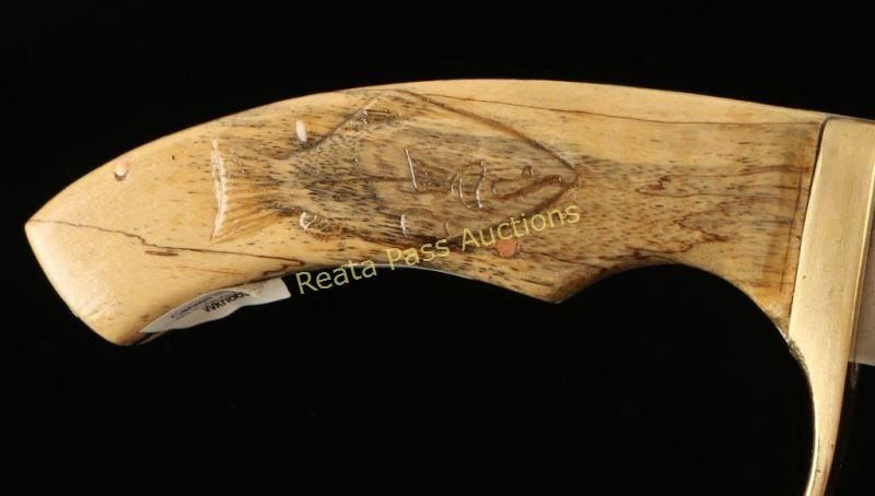 Carved spalted birch handle that depicts a seal on one side and a fish on the other with a 440 stainless steel blade and brass guard. Measures 10" overall with a 4 1/2" blade. Made by Richard Green for Alaska Creations. A truly unique knife.