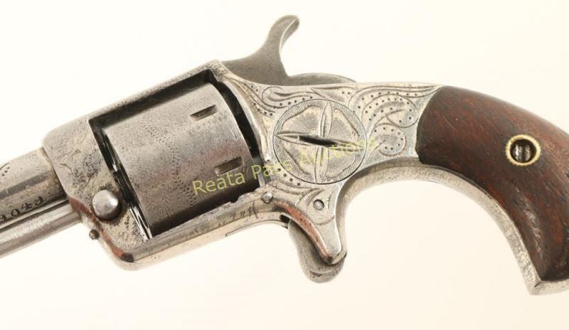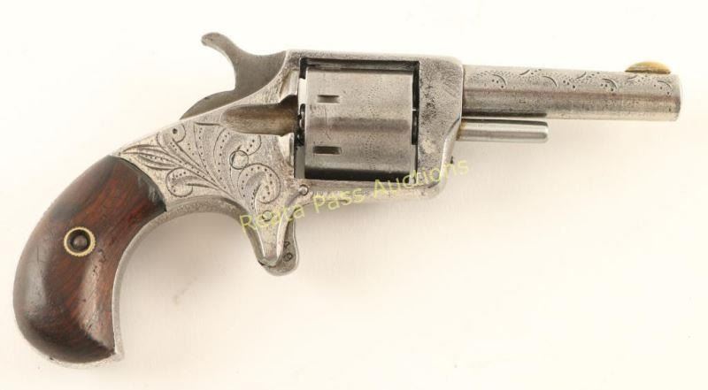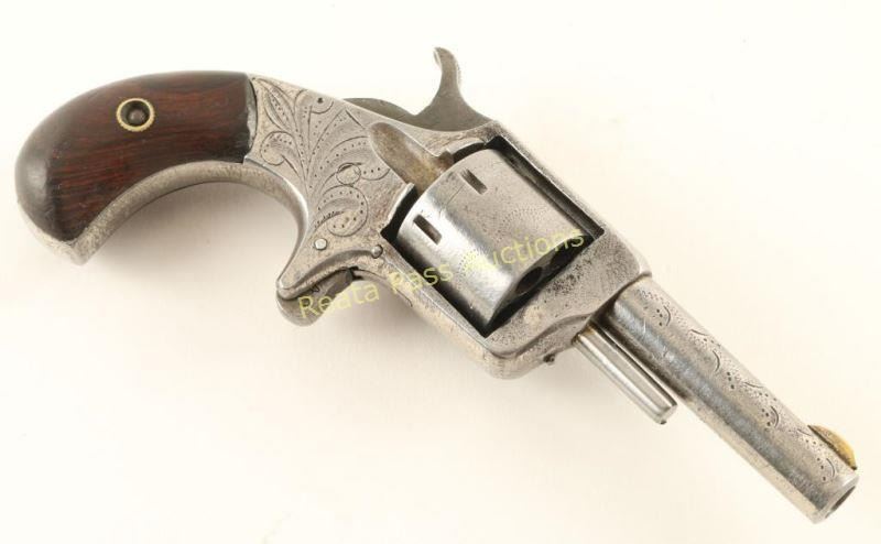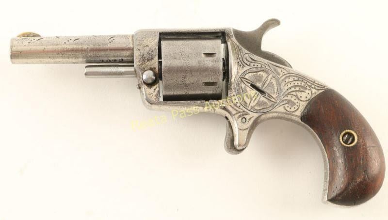 Engraved spur trigger trade-name revolver chambered in .22 rimfire, circa 1880's. Features a nickel plated finish, simple scroll engraving, 2.25" barrel, brass blade front sight, non-fluted seven-shot cylinder, smooth spur trigger, checkered hammer spur and smooth two-piece wood bird's head grips. Revolver retains a majority of it's nickel plated finish with some light scattered pitting. Action is in working order, bore appears smooth with pitting and wood grips are good. Condition is good. ***Antique Firearm***