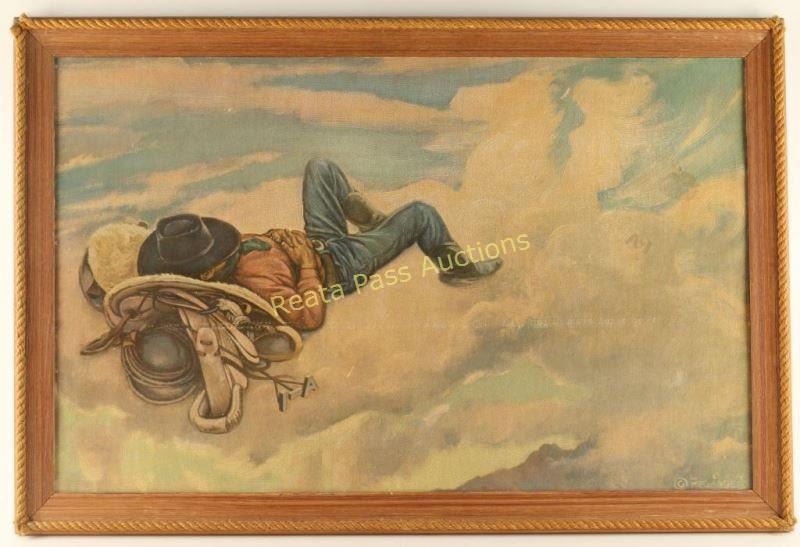 "A Cowboy's Dream" by noted Western artist Lon Megargee. Original type that was produced with a rope trimmed frame, hung in the Crystal Bar in Los Luixas, NM. Image measures 34"x21" in wooden rope trimmed frame.