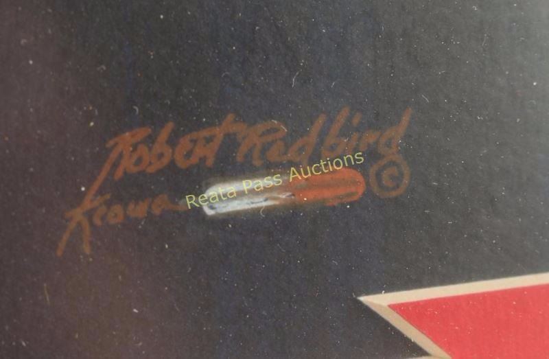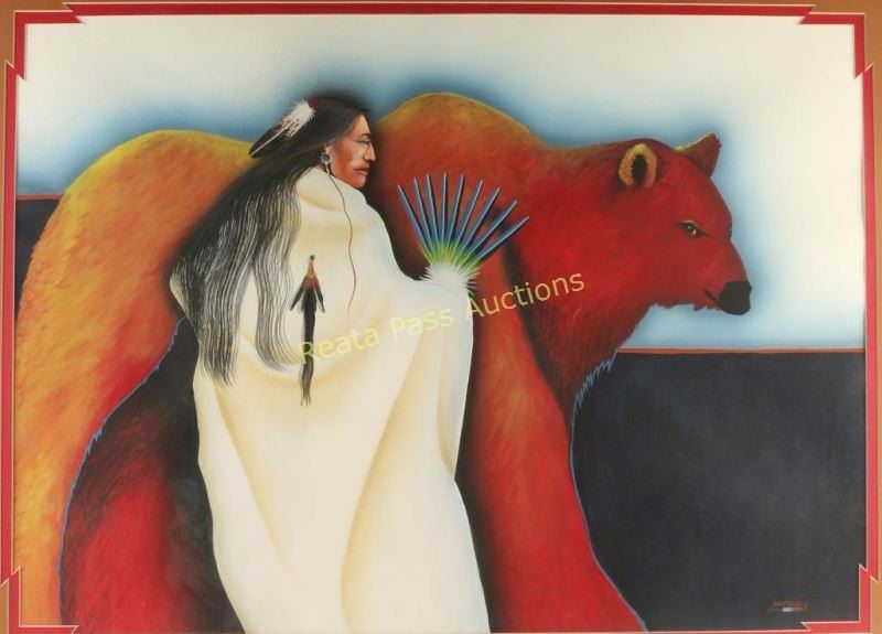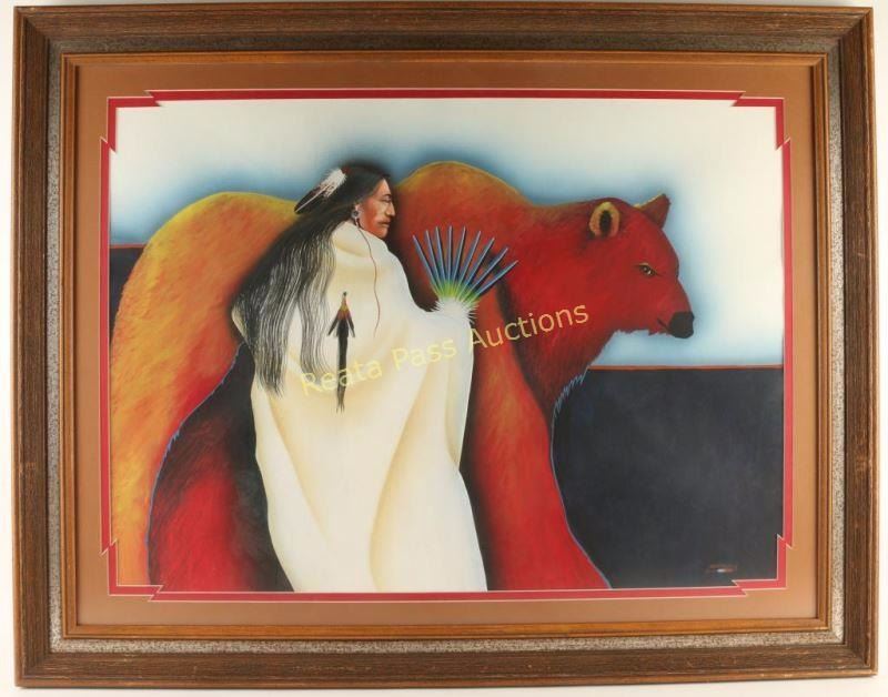 "Real Bear Legend' by Robert Redbird depicting a robed Indian standing by a bear. Signed lower right. Image measures 29"x21" in double mat with zig zag cut in wood frame.