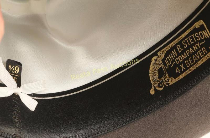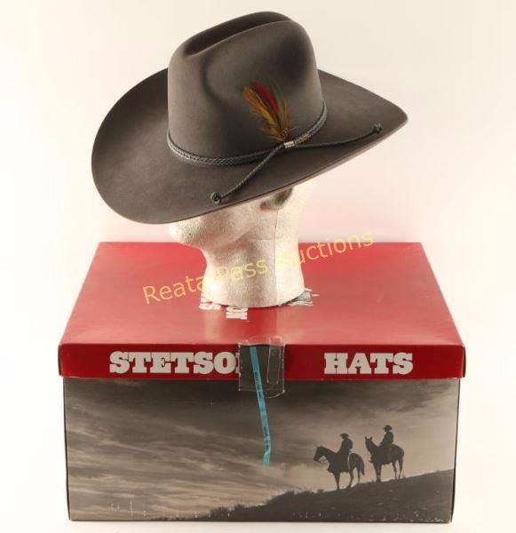 Stetson 4X Beaver size 6 7/8. Cuerda style, bullet color with braided leather hatband and feather accent. Excellent condition in box.