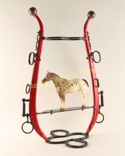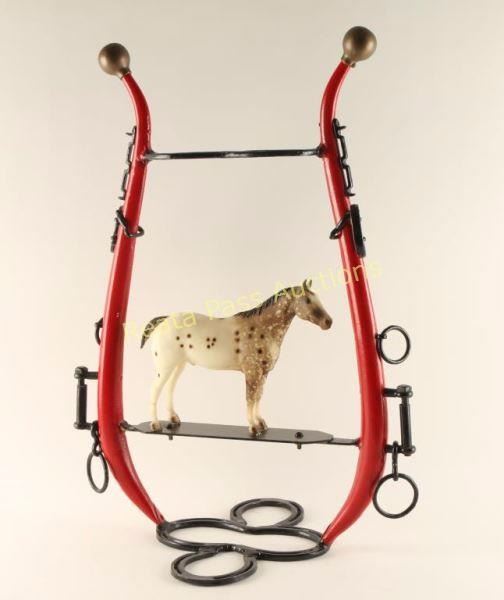 Very unique and interesting item made up of horseshoes and collar painted red and black with a plastic Appaloosa horse mounted in the middle. Measures 19"x27"x13". Great for western store display or decor. Good condition.