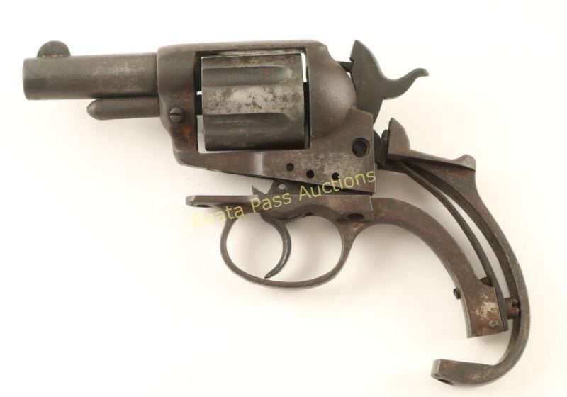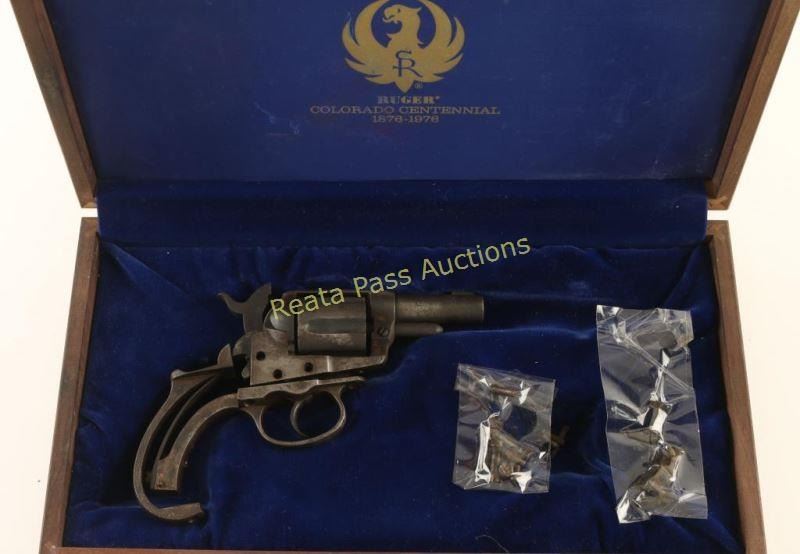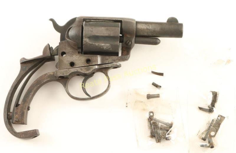 SN: 38855 'Storekeepers Model' Antique double action revolver chambered in .41 Colt, circa 1882. Parts include: 2.5" barrel with two line address & blade front sight, fluted six-shot cylinder, frame with loading gate & cylinder pin release button, hammer, backstrap, front strap/trigger guard w/ main spring, cylinder pin w/ large head, nine loose screws and some other small parts. Includes a Ruger Colorado Centennial 1878-1978 presentation case. Revolver shows evidence of cleaning, some light pitting and an overall dark patina. Condition is parts gun. ***Antique Firearm***