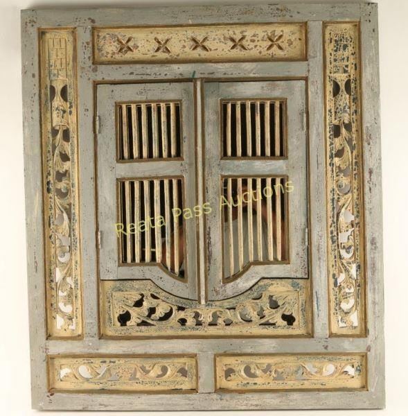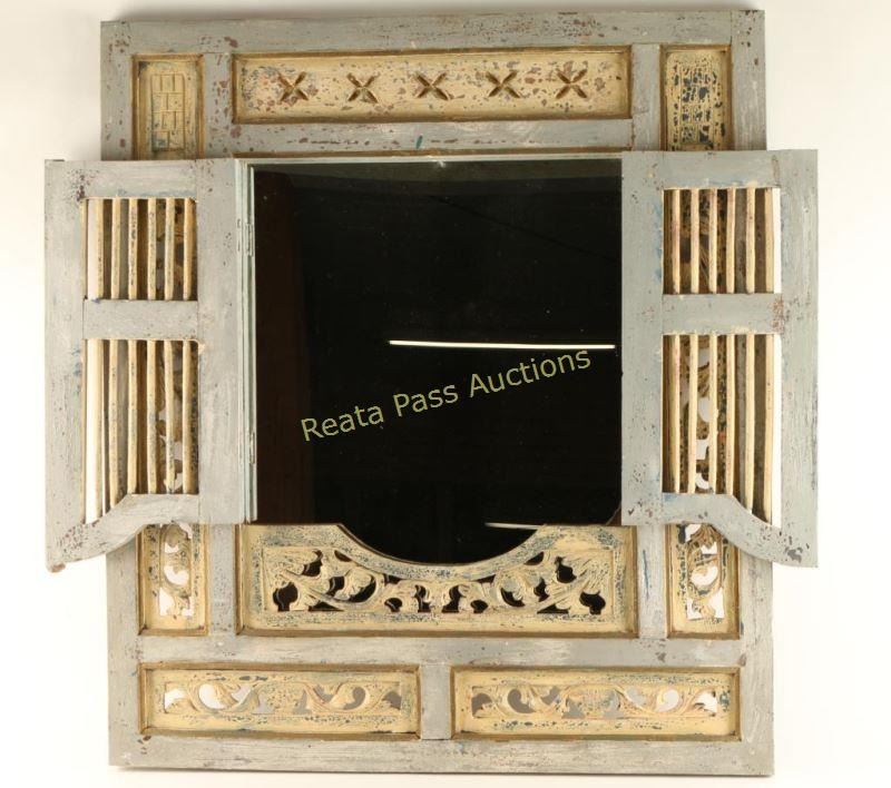 Ornate carved, scrolled wood and a floral motif surround an open work gate that swings to each side to reveal a mirror. Powder blue, blue, cream and gold tones. Measures 31 1/8"x35 1/8". Great for entryway or bedroom.