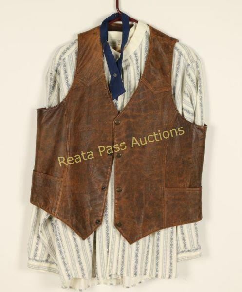 Four Snap Button Vest. Size 44 and made by WAH, in the USA. Comes with a western full button grey and white striped shirt. Very good condition.