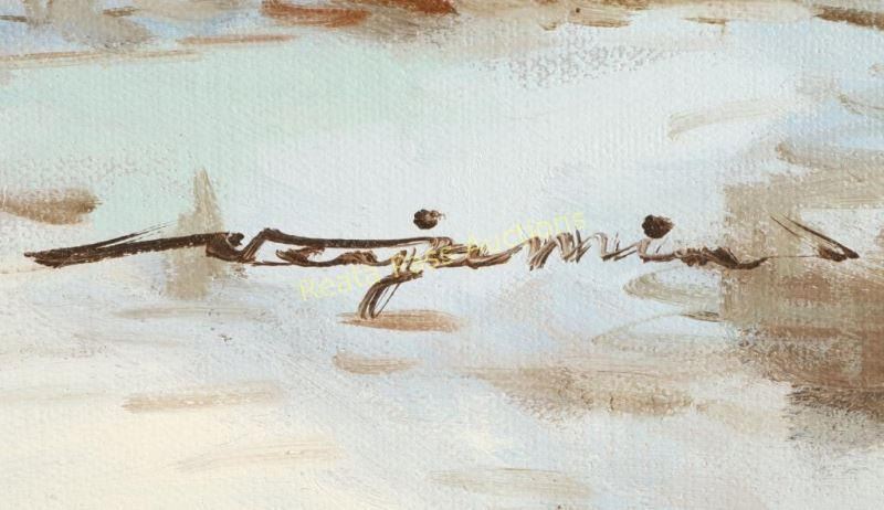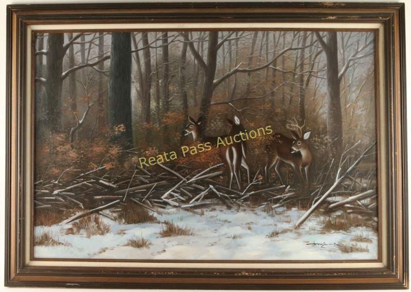 Depicting deer in a snowy forest. Signed by artist lower right. Image measures 35 1/4"x23 1/2" in wood frame with linen insets. Frame shows some dings and wear to finish.