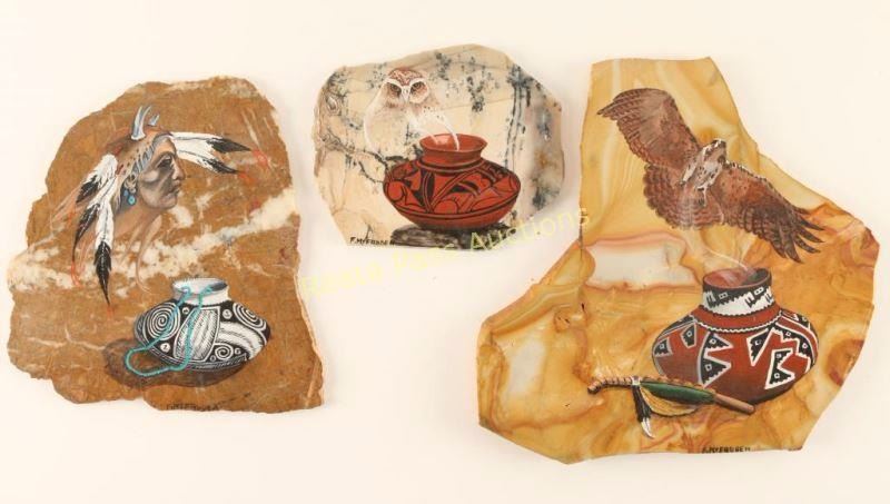 All by F. McFadden signed on lower edge and depicting Native pottery with different figures. (1) owl and terra cotta pot on white and black marble, measures 4"x5". (1) Native American in headdress with black and white pot on gold and white marble, measures 6"x6 1/2" and (1) terra cotta, black and white pot with peace pipe and hawk on variegated gold marble, measures 8"x7 5/8". Perfect for Southwest decor.
