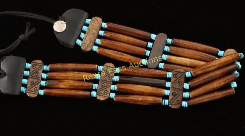 Traditional four strand has the look you love in a style that works for men & women! Made by Dine' artisan, Lisa Wiley, she used hand dyed, hairpipe tubes & spaced them with Sleeping Beauty blue, block turquoise. The strands are held in place by carved 1-1/4" tall slabs. It's 13-1/2" long & the leather ties add an additional 6" on each end. This authentic, Navajo Turquoise Heishi Bone Choker is ready for any occasion!