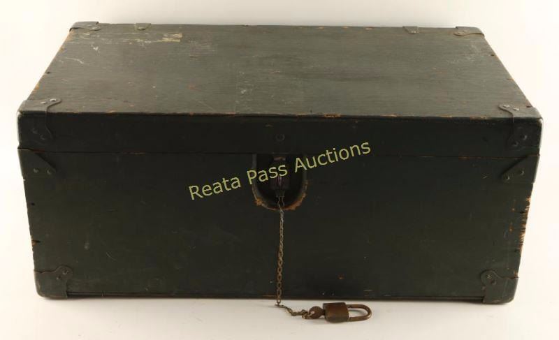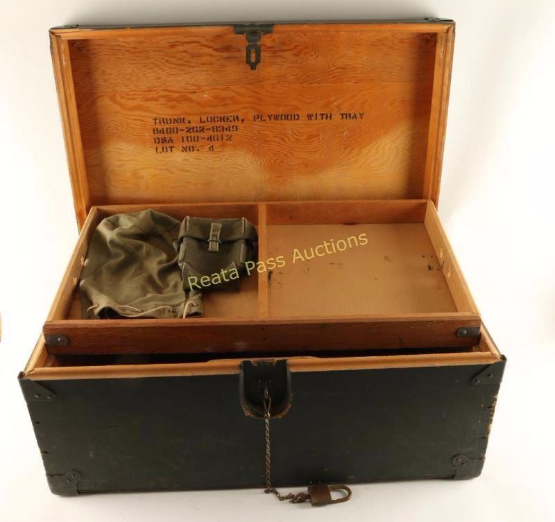 Wooden construction with metal hardware. Trunk has been painted green with 'U.S.' on top. Inside is one storage tray and two small canvas bags. Measures 29 1/2" x 12 1/2" x 17 1/4". Comes with brass padlock and key on chain.