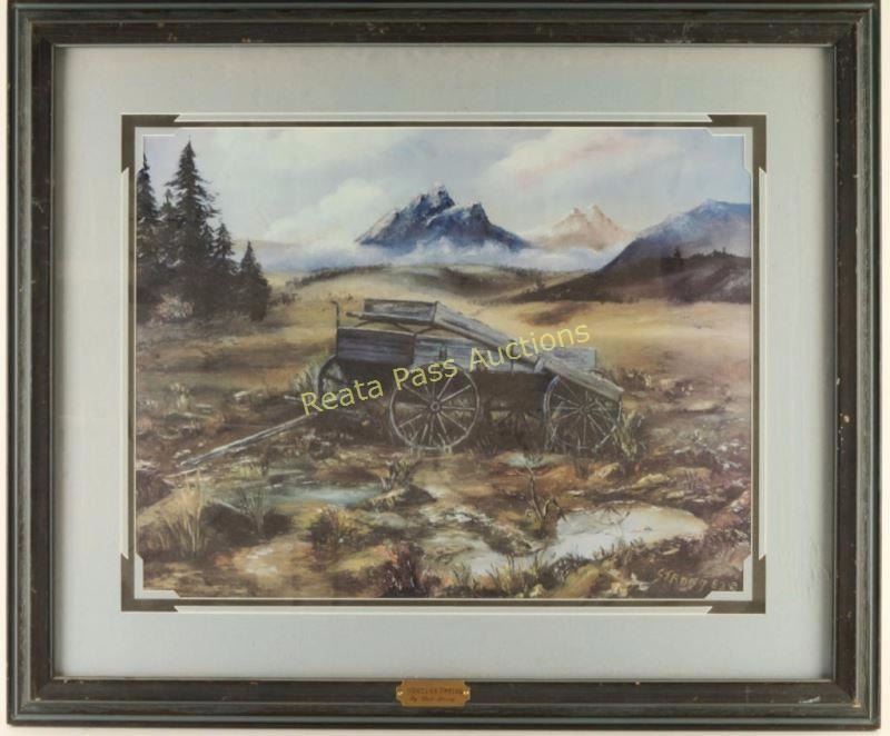"Montana Springs" depicting an old wagon with a mountain landscape behind it. 'Strong 82' lower right corner in double laser cut mat with wood frame which has a brass plate that reads "Montana Spring by Dale Strong". Image measures 21"x16". Frame has some dings and scratches on it.