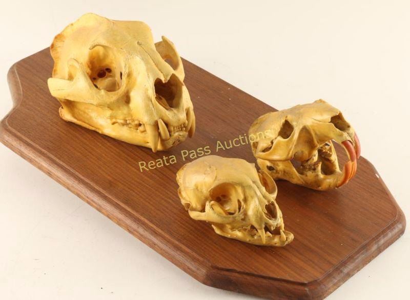 Different sizes mounted on wooden plaque. Appears to be 2 sizes of cat and 1 beaver skull. Measures 19 1/2"l x 10 1/2"w x 5 1/2"d.